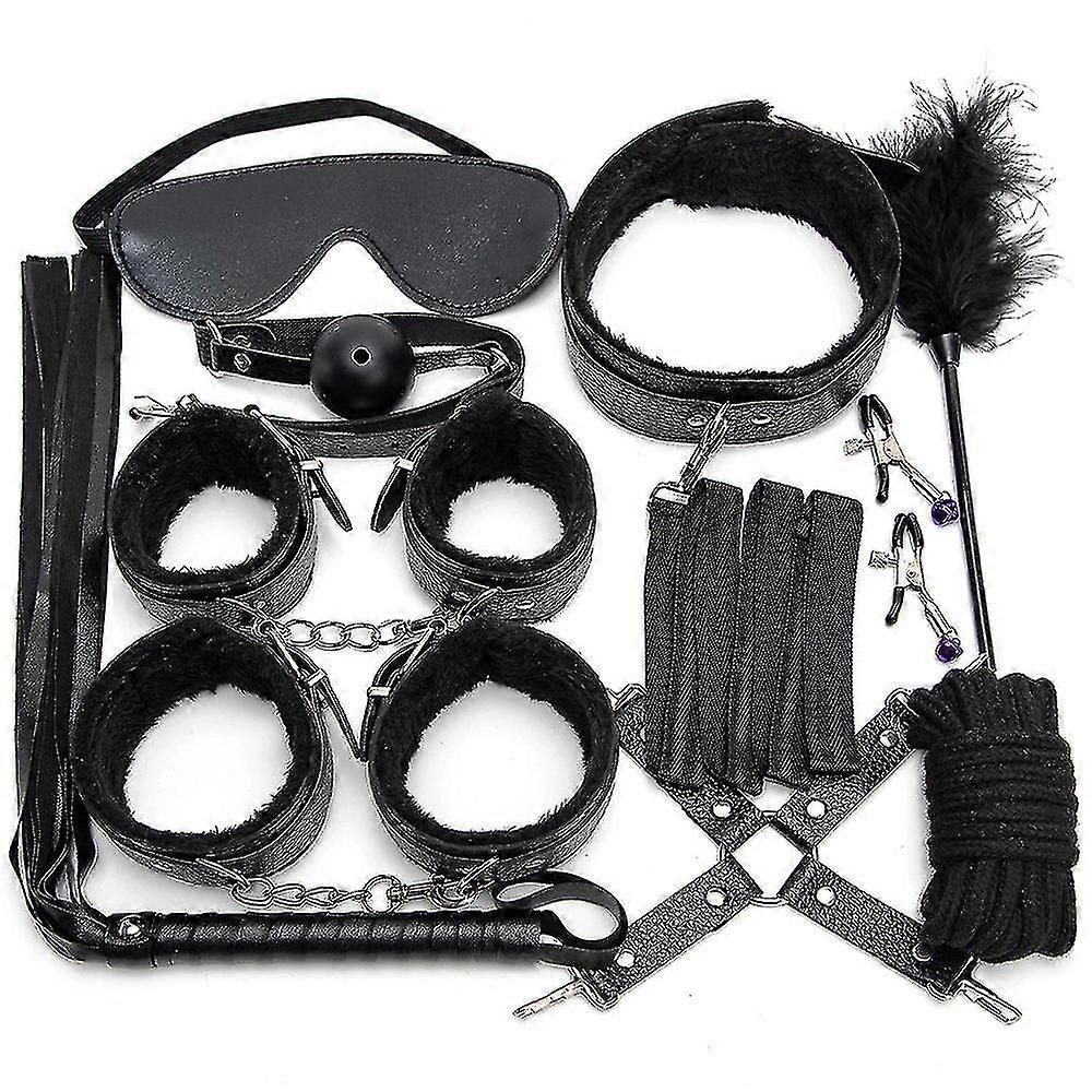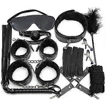 10pcs/set Leather Bodaged Kit Adlt - Handcuffs/ankle Cuffs/collar/eye Mask/mouth Stopper/whip/cotton Cord/cross Buckle/breast Clip/feather