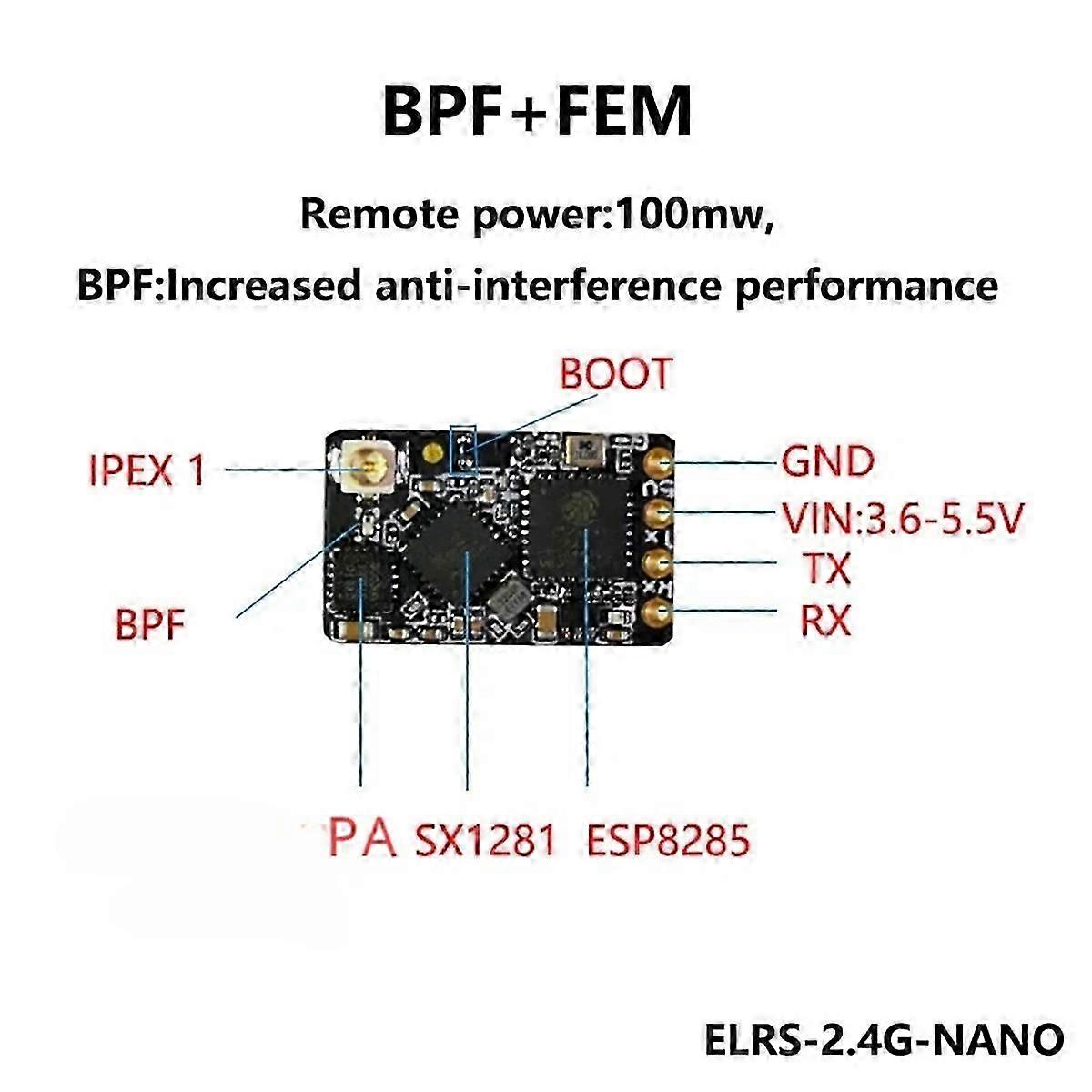 ExpressLRS aims to provide the best completely open, high refresh radio control link while maintaining a maximum achievable range at that rate with low latency. Model:ELRS 2.4G NANO RF Freq:2.4Ghz IC:SX1281+ESP8285 TX Power:100mW Connector:IPEX 1 Input Power:3.6-5.5V Firmware: for BETAFPV Nano 2400 RX 3.2.0 Colour:Black Material:PC+Plastic Package Contents: 10 x Receiver(Due to different product batches, there may be slight differences in appearance, which will not affect the use) Only the above package content, other products are not included. Note: Light reflection and different displays may cause the color of the item in the picture a little different from the real thing. The measurement allowed error is +/- 1-3cm.