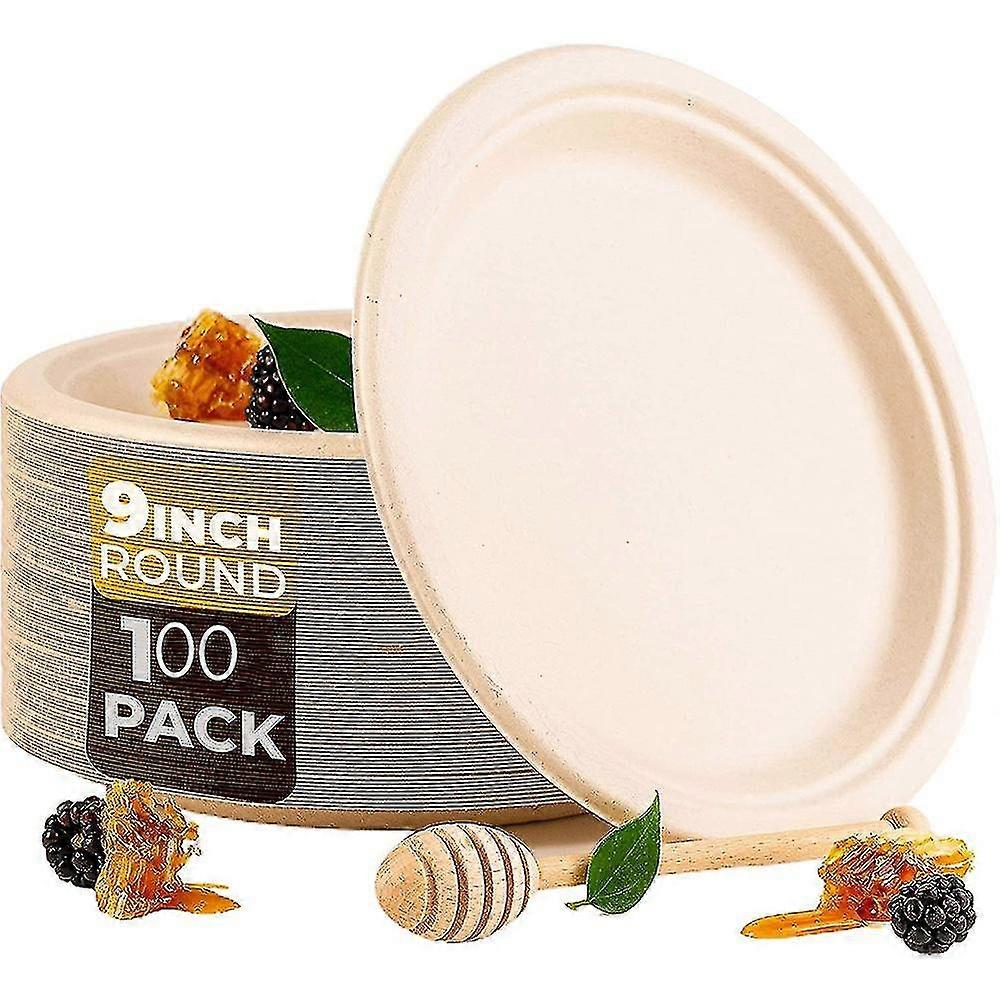 100 Pack 9in Compostable Disposable Round Bagasse Paper Plates