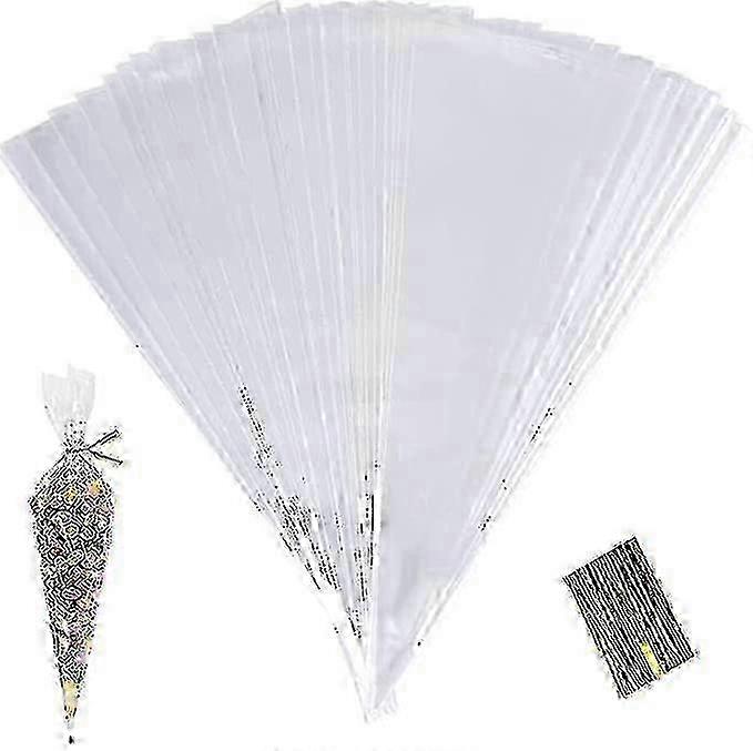 100pcs Clear Cone Candy Bags 25x13cm with Twist Ties for Sweets & Treats