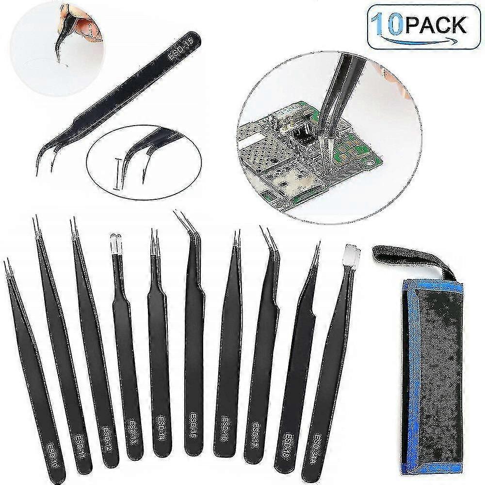 10pcs Esd Anti-static Tweezers Set Maintenance Repair Stainless Steel Tools Kit