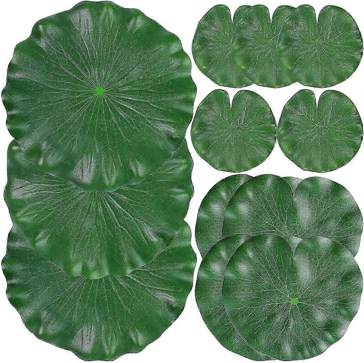 Package Include: 12 x floating foam lotus leaves in 3 different sizes.Great Lilly pads for a pond.Realistic Looking: These water lily leaves are beautiful and life-like looking. The fish are happy and the live plants are filling in nicely.Safe Material: Made of durable and soft EVA, lightweight, safe to the fish. The color of these pond leaves will stay vivid and bright on the water.The lotus leaves are thick enough for a small frog to sit on.3 Different Diameter(approx.): 3.9inch, 6.7inch, 11.4inch (10 cm, 18 cm, 28 cm). Keep the sunlight out and protect the fish from birds who are drawn to the water.The fish could hide thru the winter even all the pond plants die in winter.For Many Occasions: Easily floating on the water, the leaves are great decorations for garden ponds, fountains, aquarium fish tank, pool. Also, they are perfect for decorating home, wedding venue or parties.Specification:Material: FoamColor: GreenPackage includes:12 x Artificial Foam Lotus LeavesThese lily pads are sensational. They are realistic. Just like the real thing - the edges are ruffled, there is raised veining on the leaf, the green color is true, the leaf size is right on. They float great and sometimes end up together which also looks realistic.TIPS:The lily pads came rolled to protect its integrity. Press them with a heavy object, then put them in the water. Wet lily pads will gradually flatten because of the gravity of water.