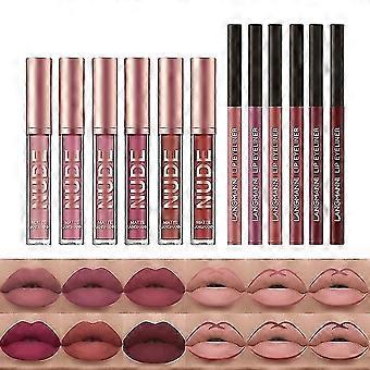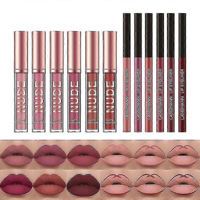 12pcs Matte Liquid Lipstick + Lip Liner Pens Set, One Step Lips Makeup Kits Pigment Velvety Nude Lip