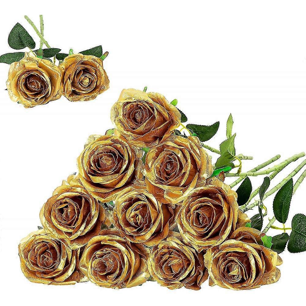 12 Pcs Artificial Silk Roses Flower Bouquet Faux Flowers Home Wedding Party Decor(gold) BTK