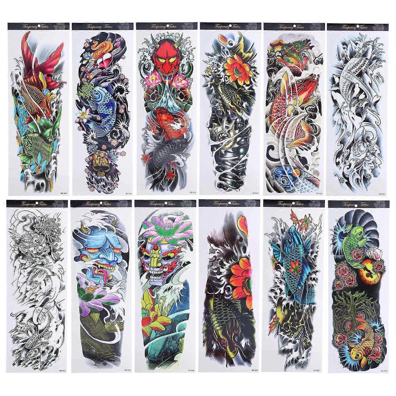 12pcs Fake Tattoo Sticker Temporary Waterproof Sweatproof Unisex Full Arm Tattoos Stickers