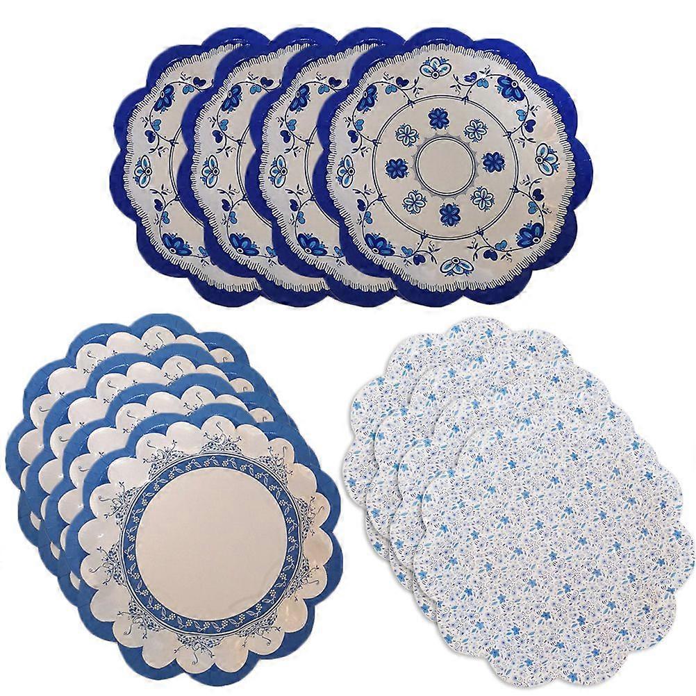 12PCS Chinese Style Flower Shape Cake Plates Decorative Blue and White Porcelain Design Paper Dessert Plates for Appetizer Wedding Party