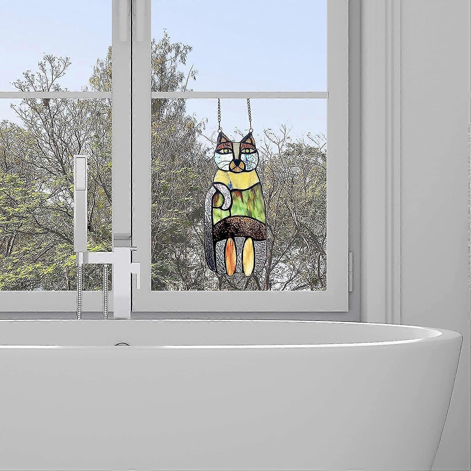 13" H Crazy Cat Stained Glass Window Panel Suncatcher, Purple, Blue, Yellow