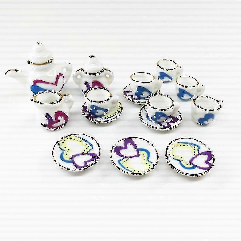 15pcs Dollhouse Miniature Ceramic Heart Print Pot Cup Coffee Tea Service Set