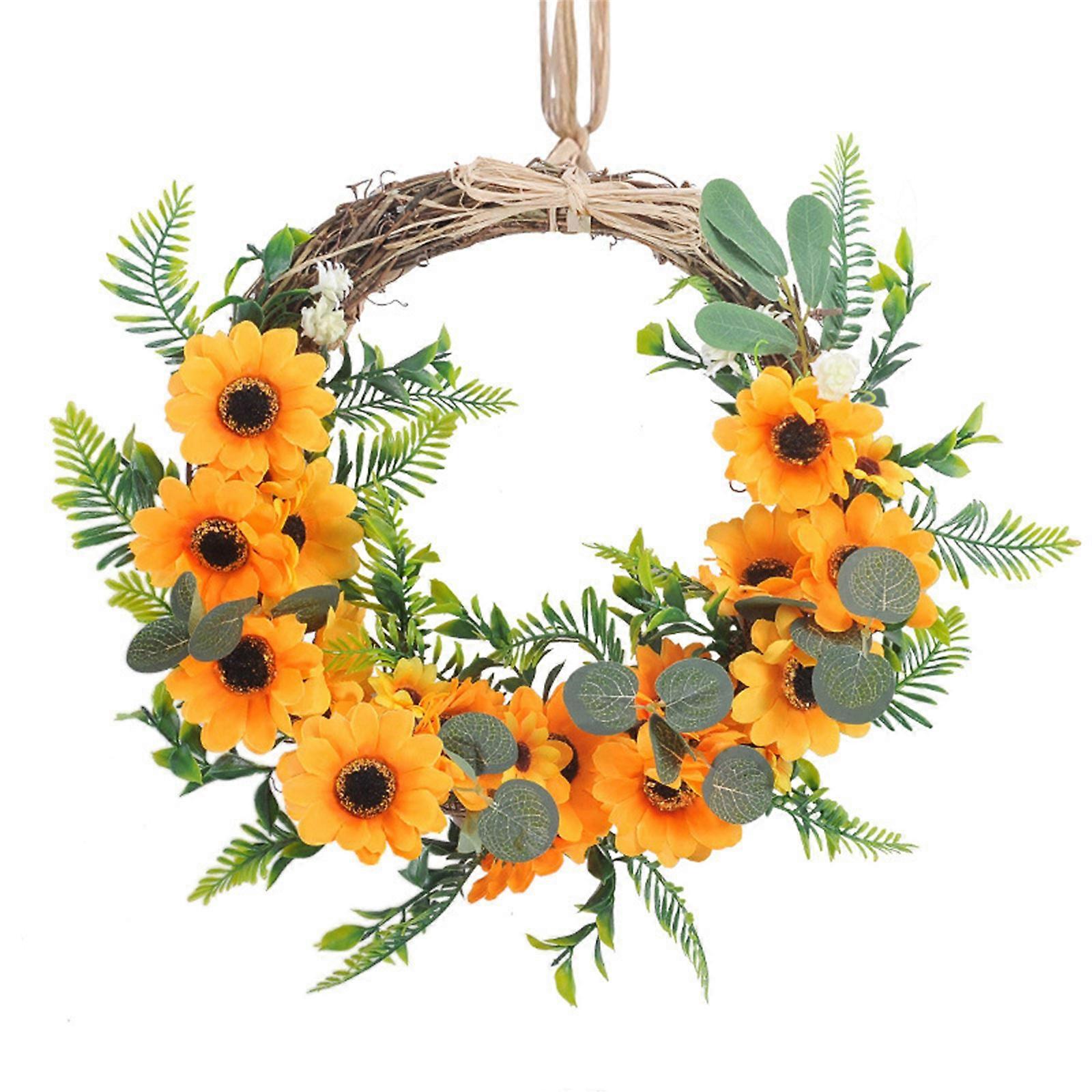16 Inch Artificial Sunflower Wreath with Green Leaves Spring Summer Flower Hanging Garland Rattan Ring for Front Door Wall Outdoor Indoor Wedding