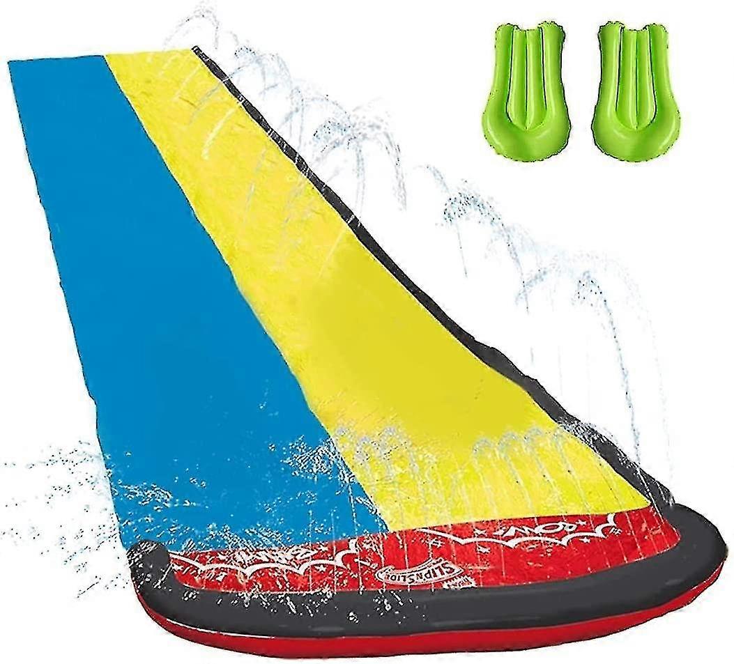 Look Me--- When you think its not slippery enough or the friction is too great, you can add a little more lubricant, dish soap and the like Connect to a garden hose and GO Enjoy the summerPerfect Summer--- The Dual Racing Water Lane is right here to slide you into the summer water fun All kids will not only be busy by staying active and enjoying the outside backyard fun but will also make unforgettable summer memories Dual Racing Water Slide--- The Water Slide for Kids Adults is a double lane slide equipped with double side railing of sprinklers and splash zone, the mat length is 16 feet long Have a game with your familyDurable Material--- The Dual Racing Water Lane for Kids Adults is a double lane slide which made from thick and heavy-duty PVC, much more durable that other products on the market With Crash Pad & Inflatable Surfboard--- With inflatable surfboard and the end of the water slide has a water collision pad, and the extra long water slide also provides a buffer space to glide smoothly and use more safely