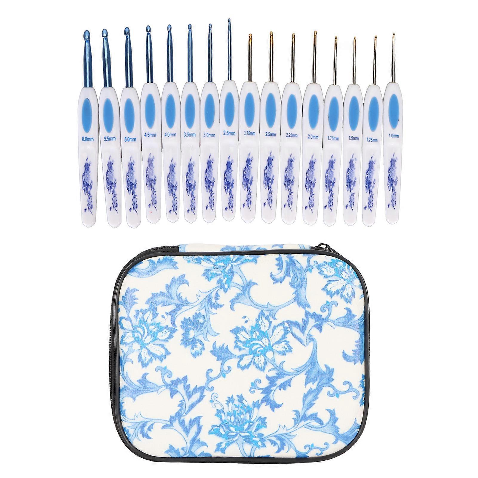 16pcs Crochet Hooks Set Blue White Porcelain Ergonomic Handle Crochet Needles with Case DIY Hand Knitting Art Tools for Beginner