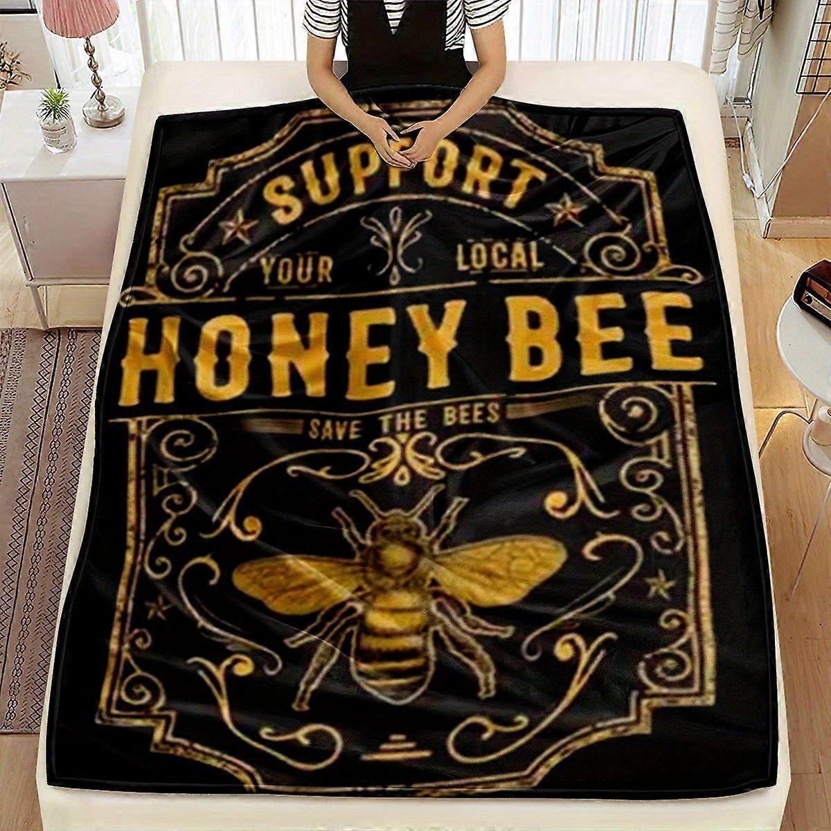 1pc "Support Your Local Honey Bee" Printed Blanket - Soft Polyester, Black with Golden Bee Design, Multi-Purpose Throw f-poiuy150