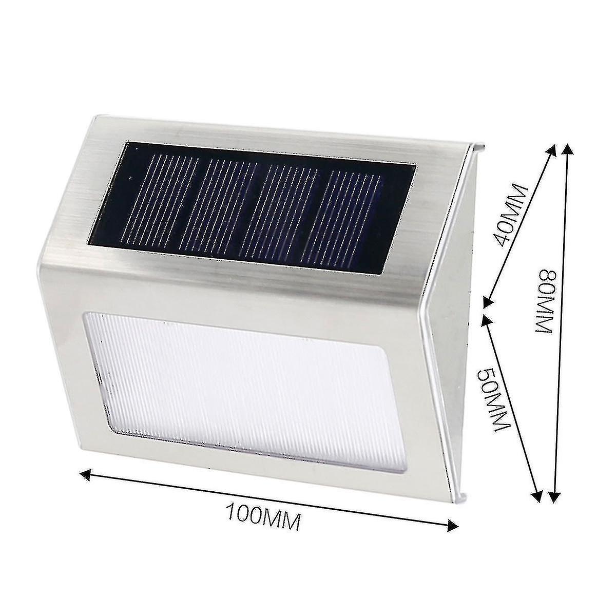 Description: Outdoor Waterproof Lights: Cut: 10*2.3*8.3cm, material: stainless steel and high strength PC. IP44 waterproof. Used for road, path, bridge, dock, stairway, fence, wall, garden, walkway, sidewalk, backyard, etc. Automatic operation The step stool automatically charges during the day and works at night when the switch is in the ""AUTO"" position. not only environmental protection but also save hundreds of dollars. Easy installationNo wiring required, you can screw the solar lights to the surface with the included screws, or just use the tape double-sided (not included) to stick them on any floor where they can absorb sunlight directly. Function: Charge for 4.5 hours under standard sunlight, light up for 6 to 9 hours. Water resistance level: IP44 Material: stainless steel + ABS + PC Solar panel: polysilicon 79*28.5 2V/90MA Use environment: outdoor stairs, balconies, fences, walls, etc. Battery: 1.2V/700mAh AA Ni-MH Light source: 2pcs x 0.06w Lumen: 10Lm Color temperature: 6500-7000K Working hours: 6-9h Charging time: 4.5h Gross product weight: 206 g (two packs) Quantity delivered: 2 pieces Package included: 2 X Solar Wall Light