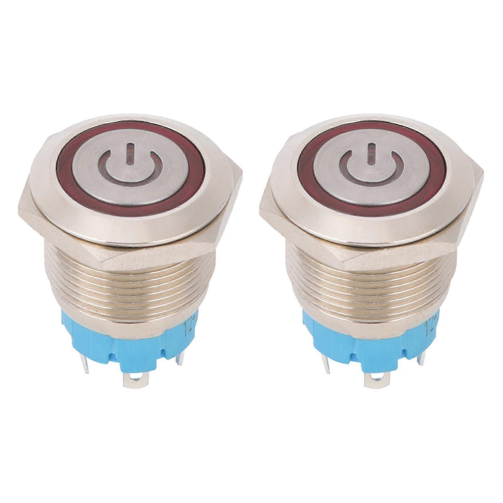 2Pcs Push Button Switch 4-Pin 19mm Round Flat Head Stainless Steel Shell with Light IP65 12-24VDCRed