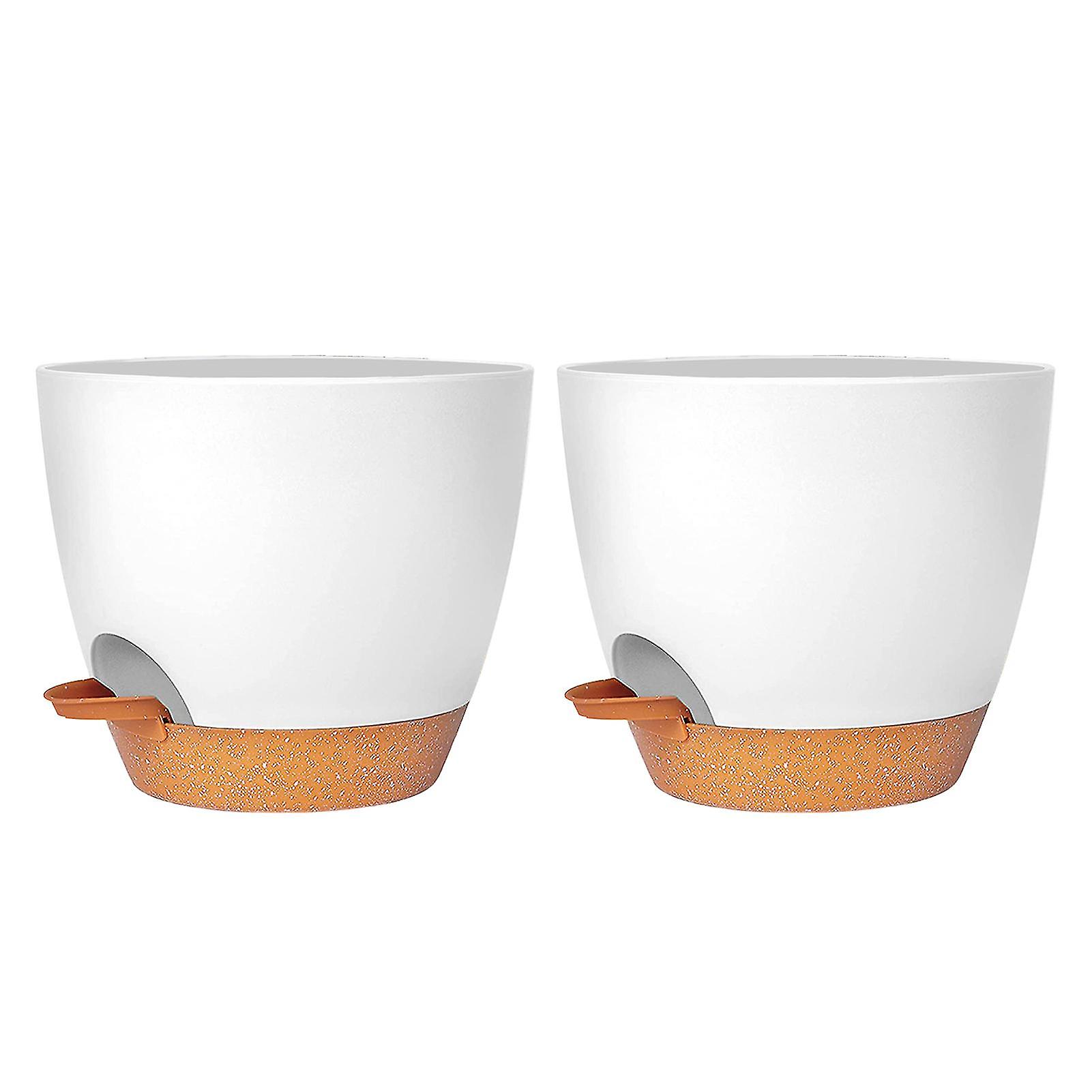Large Capacity: 8inch extra large self watering pot with large deep reservoir makes it easy for when go on vocation that no need someone to come over water plants and flowers. 2-3 weeks extra water. The built-in tray protects decks, patios, or indoor surfaces.2 In 1 Self Watering Pots: The planters have a removable watering feeder. You can water from the bottom directly or watering from the top, the excess water will drip into the bottom reservoir. It prevents root rot, making sure your plants don't sit in water and have enough air to circulate in the soil. Besides, the bottom of the 60oz large reservoir provides optimal moisture for your plants.Drainage Holes Design: Mesh drainage holes and deep planting space promotes root growth to keep plants healthy. It keeps soil drained and ventilated to prevent soil-loss and helps protect against overwatering. To use a pot with a detachable saucer that can be empty the excess water easy and the soils can be keep dry out somewhat. Material: The pots are made of high quality plastic material. It's lightweight, durable, and sturdy plastic with a matte exterior finish for a clean modern look. Sturdy and thick pots are shatter-resistant, making it easier to protect plants and soil than other pots.Occasions: Modern planter gardening makes it possible to grow beautiful plants indoors. It can decorate your windowsill, desktop, living room, kitchen, bedroom, bookshelf, garden, office, etc.