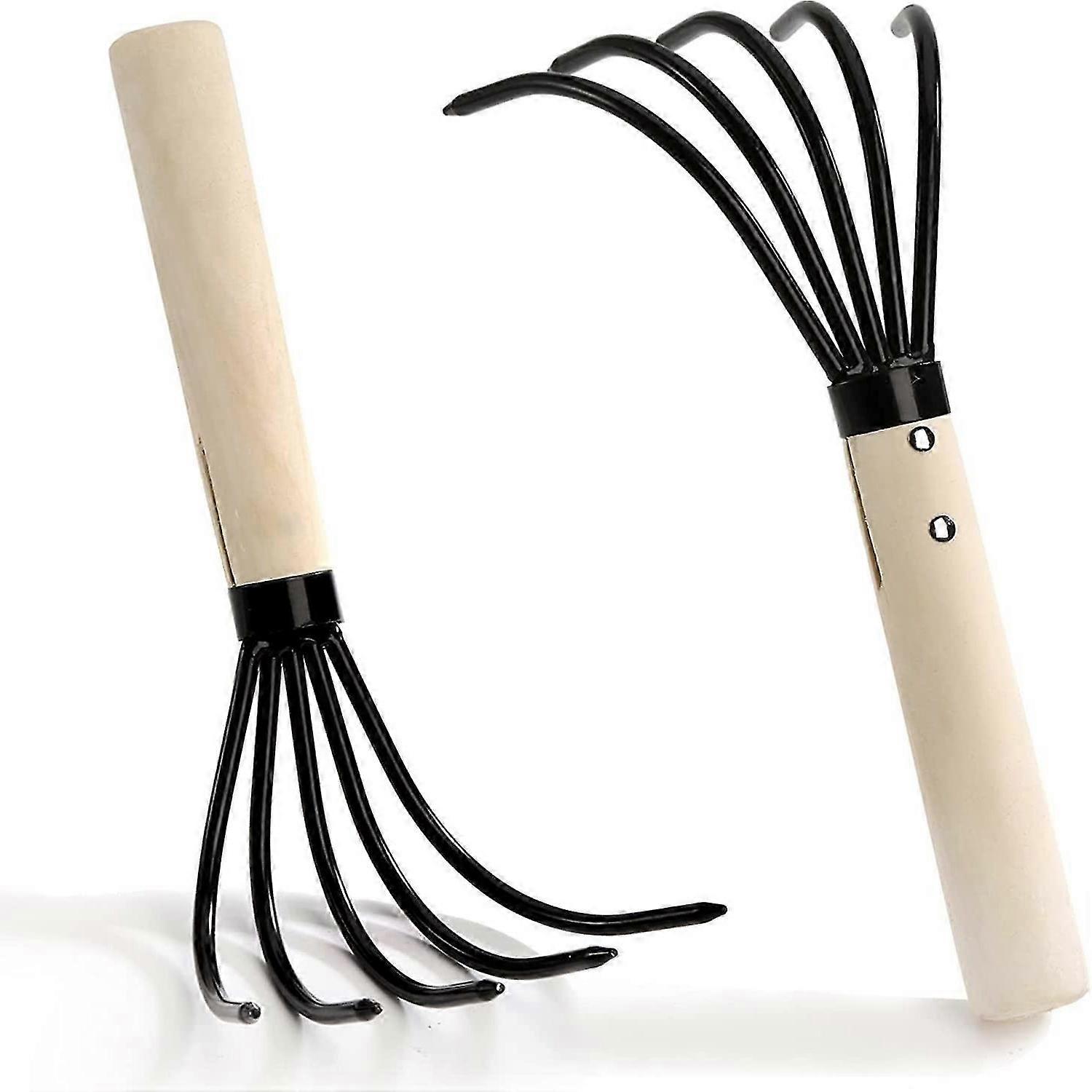 2 pcs 5-jaw harrow hand tiller with short wooden handle garden hand rake tool