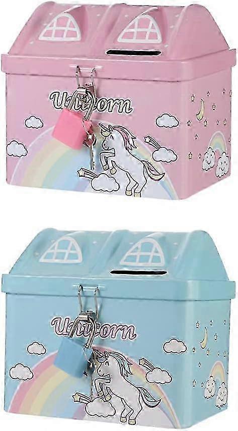 2Pcs Unicorn Piggy Bank House Saving Pot Money Coin Bank Metal Coin Box with Lock,11.5X10.5cm
