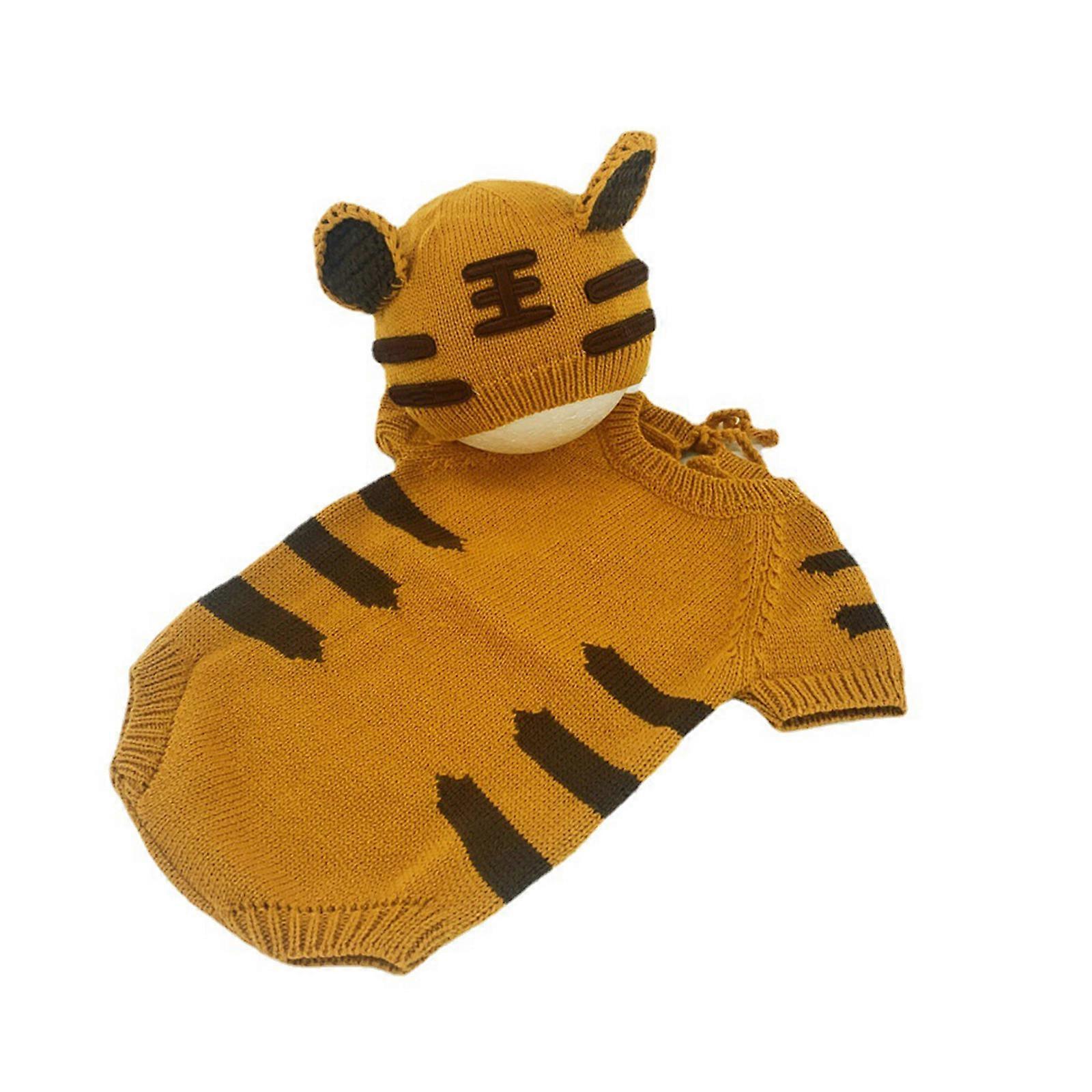 2 Pcs Newborn Photography Props Knitted Cute Tiger Baby Romper Hat Set Infants Photo Shooting Outfit Beanies Cap Jumpsuit Bodysuit Fotografia Clothes