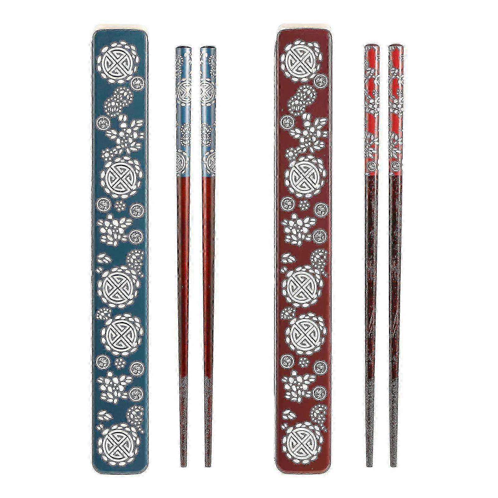 Package includes: Two pairs of reusable chopsticks with two exquisite plastic casesthe colors are red blue. The tip of the chop sticks are more tapered, length is 23 cmwhich is the stard Japanese chopsticks. Portable chopsticksEach pair of chopsticks comes with an exquisite retro plastic case, which is good sealing , reusable , waterproof sturdy. It is convenient to put it in your pocket or lunch bagyou can use it at home, work, camping, hiking or eating out, you can take it everywhere you go. Safe materials: These long chopsticks are made of natural wood with wood grain.Compared with other materials chopsticks , our chopsticks no smell, no BPA, mildew resistant moisture-proof, they will not bend or crack in the dishwasher can be reused for a long time. Non-slip design:The small raised particles on the tip of the chopsticks japanese increase grip. The square design on the upper part of the chopsticks wooden makes it easier to hold not easy to roll when in use . Perfect for beginnersideal for adults kids. Perfect giftThe chopsticks gift set have elegant Japanese style design. The upper part of the chopsticks the cases are printed with Japanese style patterns, exquisite elegant,not fade.Perfect gift for birthday, wedding, Mother's Day, Father's Day, Halloween, Thanksgiving Day, Christmas, New Years other festivals.