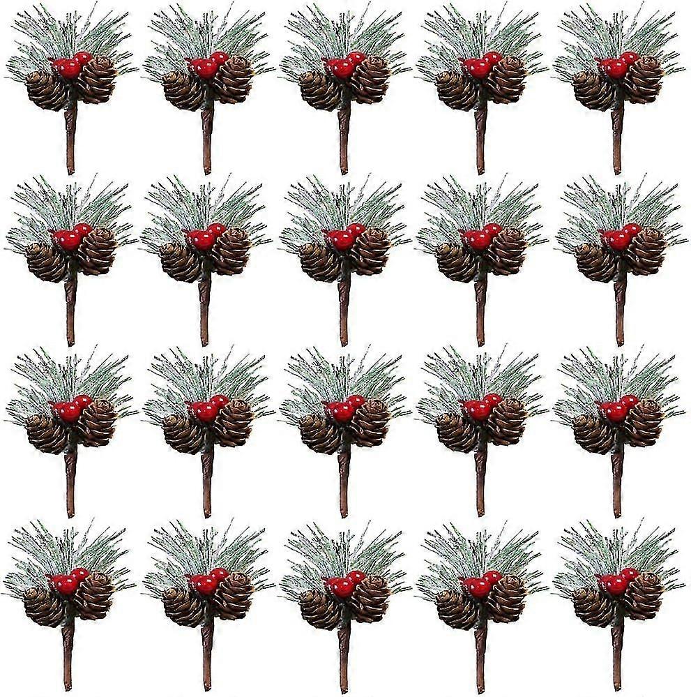 20 Pieces Artificial Pine Picks, Red Berry Stems With Snowflakes Flocked Holly Mini Artificial Pine Branches For Christmas Tree Decorations Diy Crafts