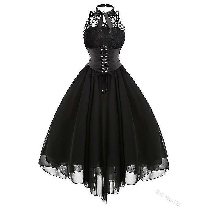 2022 Women Gothic Punk Vintage Party Dresses Sleeveless Cross Back Lace Patchwork Halter Lace Up Court Corset Swing Dress