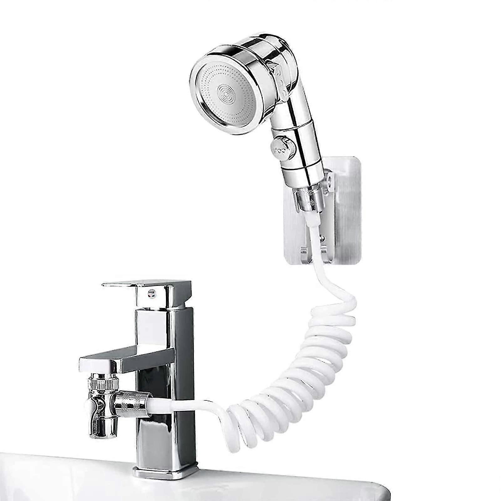 "3 shower modes: The shower head has 3 different shower modes: massage mode (pay attention to strong water flow); rain mode; mixed mode. At the same time, it is equipped of a one-button water stop function and the mode can be selected according to need.Reliable quality: The shower head is made of high quality ABS plastic, and the surface of the shower head adopts electroplating process, which has very good heat resistance, light weight and is very convenient to use .EASY TO INSTALL: Bathroom hand shower set includes self-adhesive backing, water separator, mini shower head, extendable hose and converter (faucet not included). Installation does not require any drilling and will not damage the wall. Installation can be done by itself in 10 minutes.Versatile Use: This sink shower head set is perfect for washing fruits and vegetables or cleaning the sink, as well as washing hair, bathing pets, and more. Ideal for installation in kitchens and bathrooms.Humanized Design: The spring-loaded PU telescopic tube is fully open about 1.5 meters, which can be adjusted to the most comfortable position according to different needs.Made of high quality ABS material with multi-layer coating on the surface for longer service life. Lightweight, compact and flexible, the shower head provides a gentle shower and prevents backflow. It is perfect for shampoo in the sink, bathing pets or children, cleaning sinks or bidets and other bathroom jobs.specificationMaterial: chrome-plated ABS, stainless steel Installation method: screw-on Color: silver3 modesMassage mode: powerful jet and dense water, giving you a special experience. Rain Mode: Comfortable and uninterrupted stream of water, silky water strengthens your skin and makes you feel the rain. Blending Mode: Produces silky yet powerful water at the same time, allowing you to enjoy spraying."