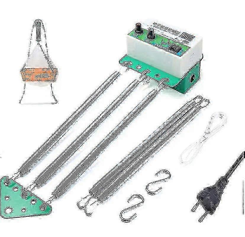 Instructions for use: hang the controller, the motor is up, the triangle is down, and the height cannot be lower than 1.8 meters, otherwise there is no room for swinging up and down.Swing up and down is more scientific: the cradle swings up and down, and the amplitude of the up and down swing can be controlled to avoid damage to the baby's brain. Babies can rest and fall asleep better thanks to the soothing swing of the rocking spring.Load Capacity: The baby bassinet dial recommends a maximum load of 18kg, 3 springs for 6kg-8kg, 4 springs for 8kg-11kg, 5 springs for 11kg-15kg.Adjustable 4 time levels: You can set the shaking time. (One press 60 minutes, two press 120 minutes, three press 180 minutes, four press 240 minutes). The timing function is an additional function of the controller. If it is not turned on, it will not affect the use.Easy: Safe and easy to use, free your hands, let your baby sleep well, and make mom easier.Product Notes:1. Determine the total weight of the quilt for children and cradle and basket, and calculate the weight value according to the number of feathers (3 pieces: 6-8kg, 4 pieces: 7.5-11kg, 5 pieces: 11.5-15kg).2. Suspend the controller, the motor is up, the triangle is down, and the height cannot be lower than 1.8 meters, otherwise there is not enough space to swing up and down.3. Use the S hook to hang the bracket under the triangle, and connect the power to the host. Gears are sometimes set to 0 and 10 if there is an entry problem. 0 and 10 can be either the fastest or the fastest. Try first to find which gear is the slowest, then slowly adjust to the slowest. Appropriate swing speed. Can be used normally.4. It has been found that the transmission rope makes a very loud "pop" sound during the shaking process. The governor needs to be turned slightly until the "pop" is gone, so that the amount of jolt is reasonable and the drive rope is durable.5. Different weight loads (within 19kg of the machine). The governor should be adjusted to a different standard before shaking. The lower ratio is larger.Instructions for use:1. Put the baby and items in the holder first, turn the dial to ON, turn the quick dial to the O position, and set the timer button to the rocking time you want.2. Slowly turn the speed control towards the large turntable and hold on each half of the turntable for 8 seconds. Observe whether the shaking is appropriate and adjust until it is appropriate.3. After setting up the machine Note: Due to the light and screen setting difference, the item's color may be slightly different from the pictures. Please allow slight dimension difference due to different manual measurement.