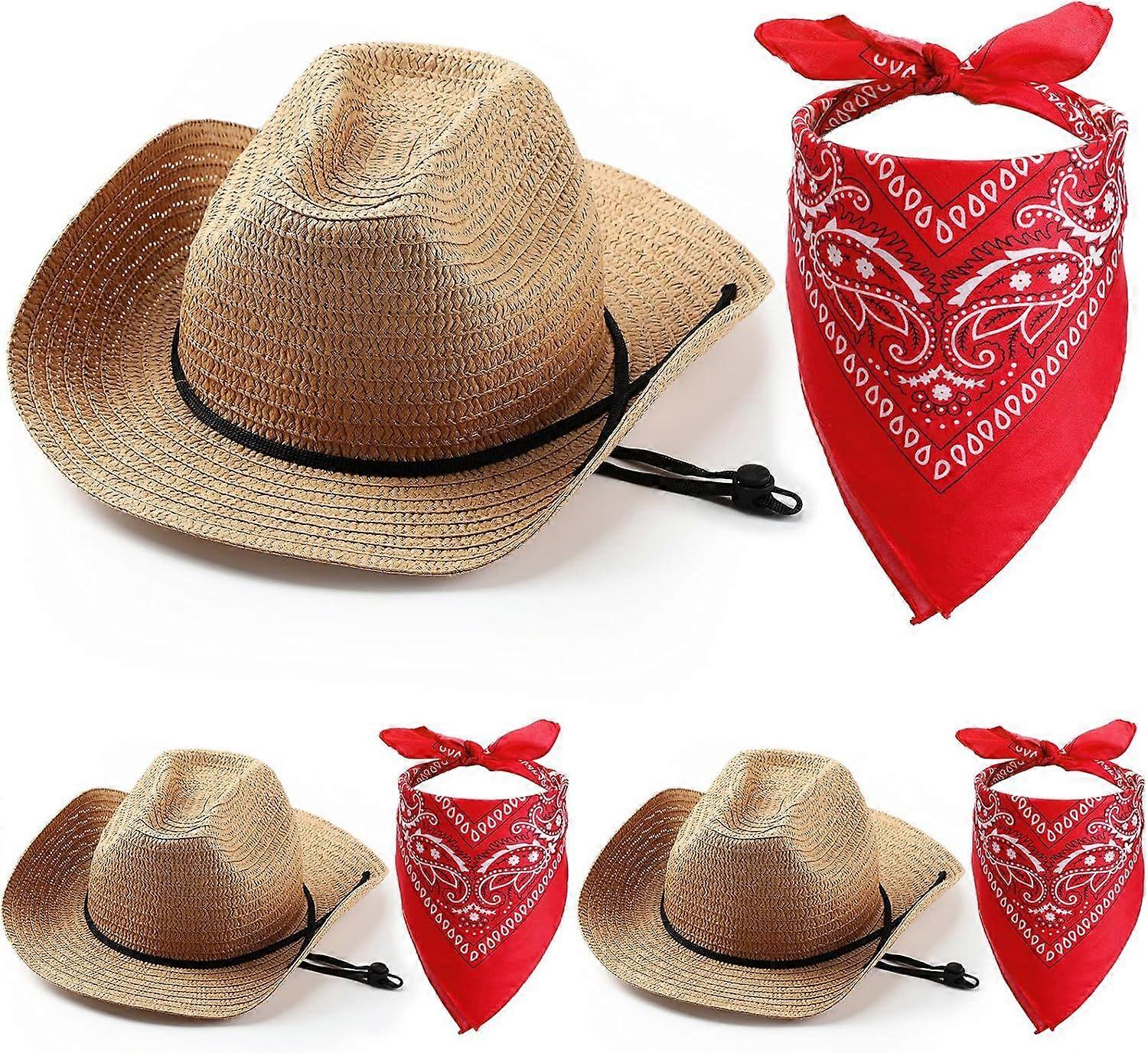 2025 Latest Model Cowboy Hats Set of 3 with Red Bandanas - Classic Western Cowboy Party Ha