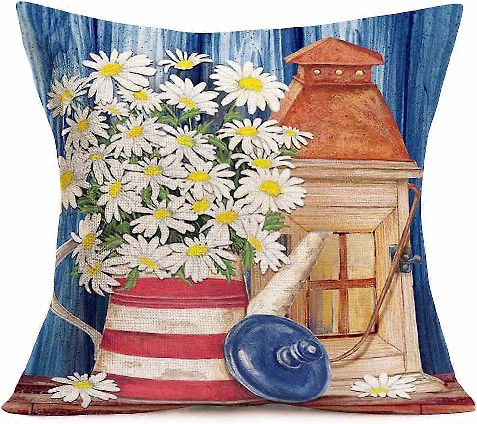 20X20 Inch Pillow Cover Rustic White Daisy Flower with Retro Red and White Stripes Teapot Home Pillows Decor Outdoor Pillow Cases Cotton Linen Navy Wo