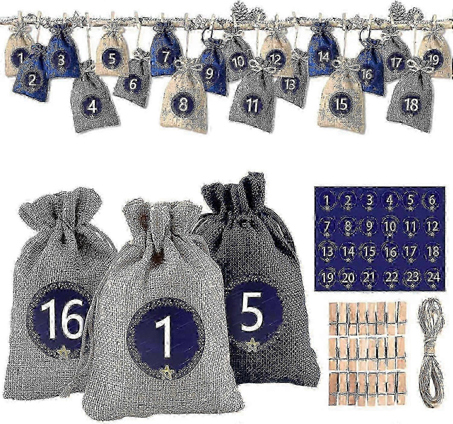 Product parameters: Material: Imitation linen Color: Linen jute sack,Gray,Navy Size: Sack: about 10 x 14cm Small clip: 1 x 4.5cm Hemp rope: 10m Sticker: about 4.5 x 4.5cm in diameter Package Includes: 24 x cloth bags (8 linen jute bags 8 gray 8 navy) 24 x stickers with the numbers 24 x wooden clips 1 x 10m hemp rope [advent calendar] 24 advent calendar bags 3 different colors (8 beige 8 blue 8 gray bag size: 10 x 14 cm) 24 digital stickers 24 wooden clips 10 m hemp rope. The cloth bag is made of natural linen and has no unpleasant smell. [Christmas Fun] Pack various small gifts into 24 bags to create surprises for your family friends and lovers making all mysterious puzzles. [Perfectly Matching] You can hang the cloth bag on the wall on the stairs or on the shelf. The cloth bag is tasteless non-toxic washable and recyclable. [Suitable for many occasions] The cloth bag is suitable for various occasions. It can be used as a Christmas gift bag Halloween candy bag christening thank you gift etc. Note: Due to the light and screen setting difference, the item's color may be slightly different from the pictures. Please allow slight dimension difference due to different manual measurement.