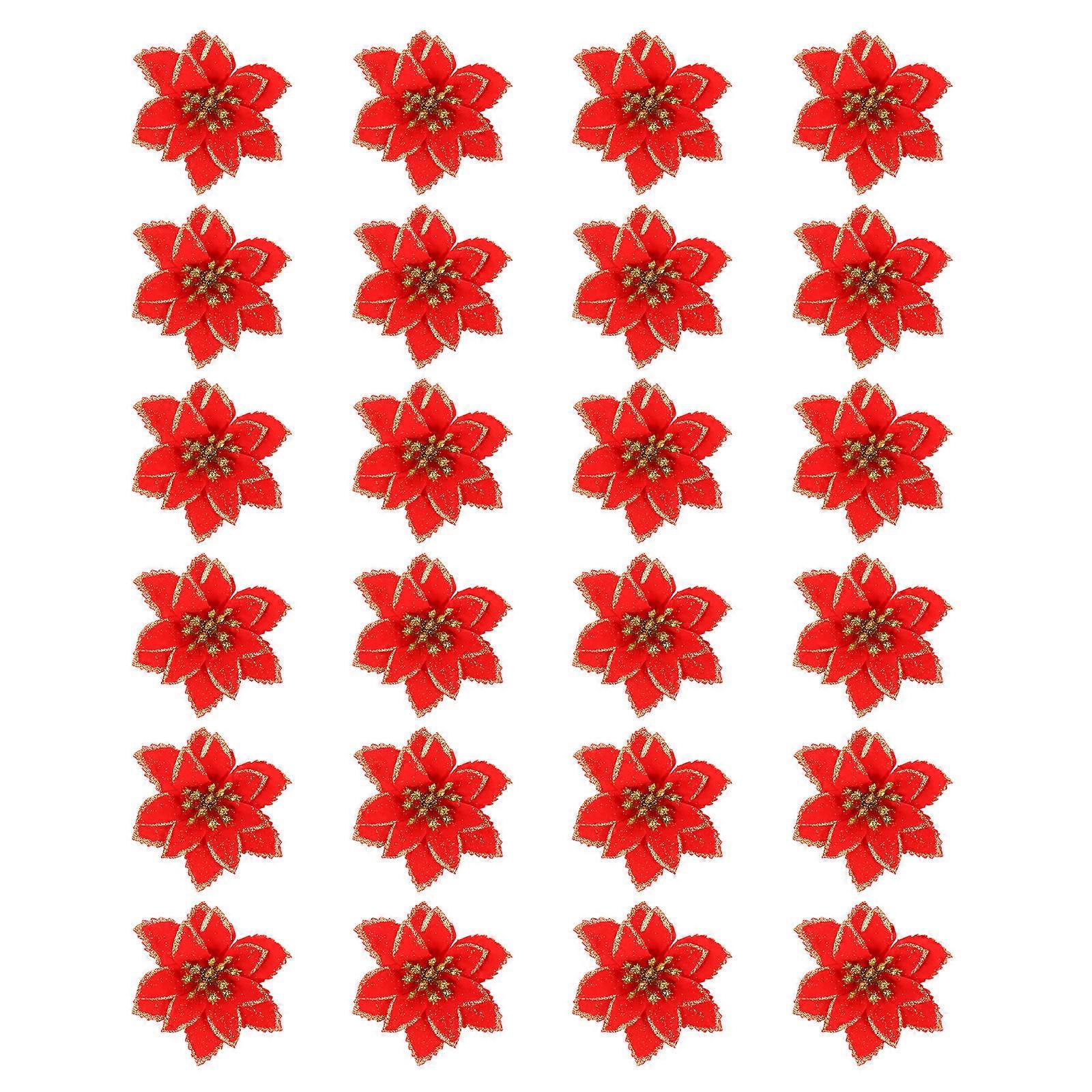 24pcs Artificial Glittery Christmas Flowers with Flash Powder, Lifelike Red Tree Flower Props for Window Wall Decoration, Festive Holiday Scene Layout