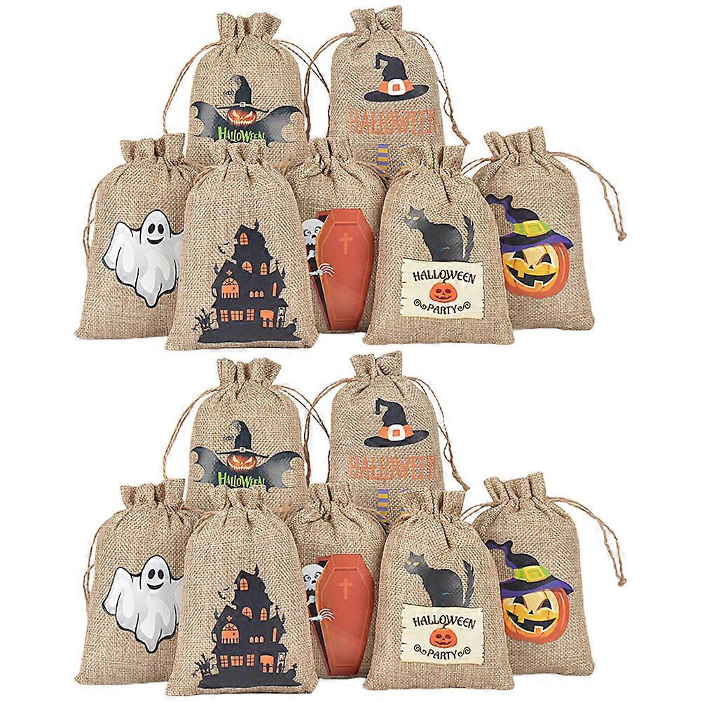 24pcs Halloween Gift Drawstring Bag Linen Goodies Packing Bag Party Treats Bag Halloween Supplies Mixed Style