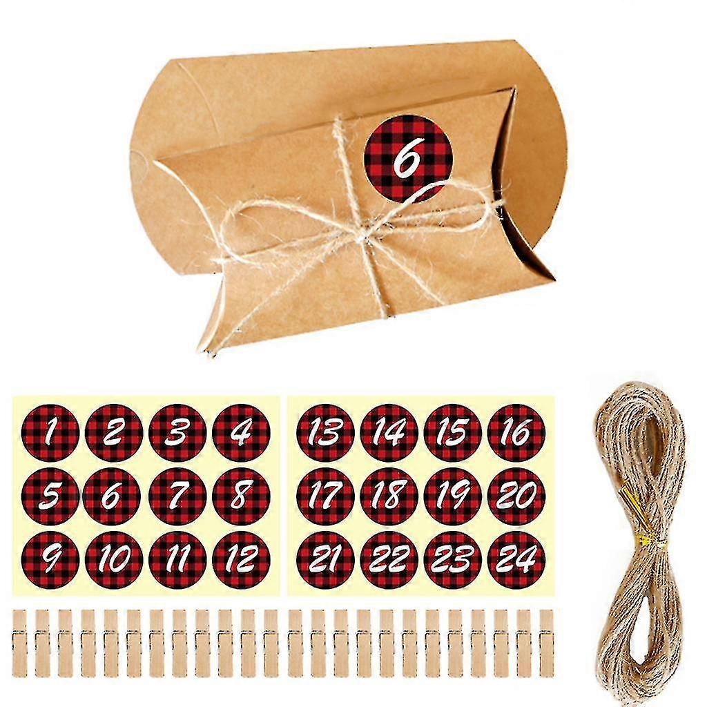 24 Sets Christmas Advent Calendar Candy Pillow Boxes With Number Lapel Wooden Clips Hemp Rope Diy Xmas Countdown Treat Bag Packaging Box Decoration