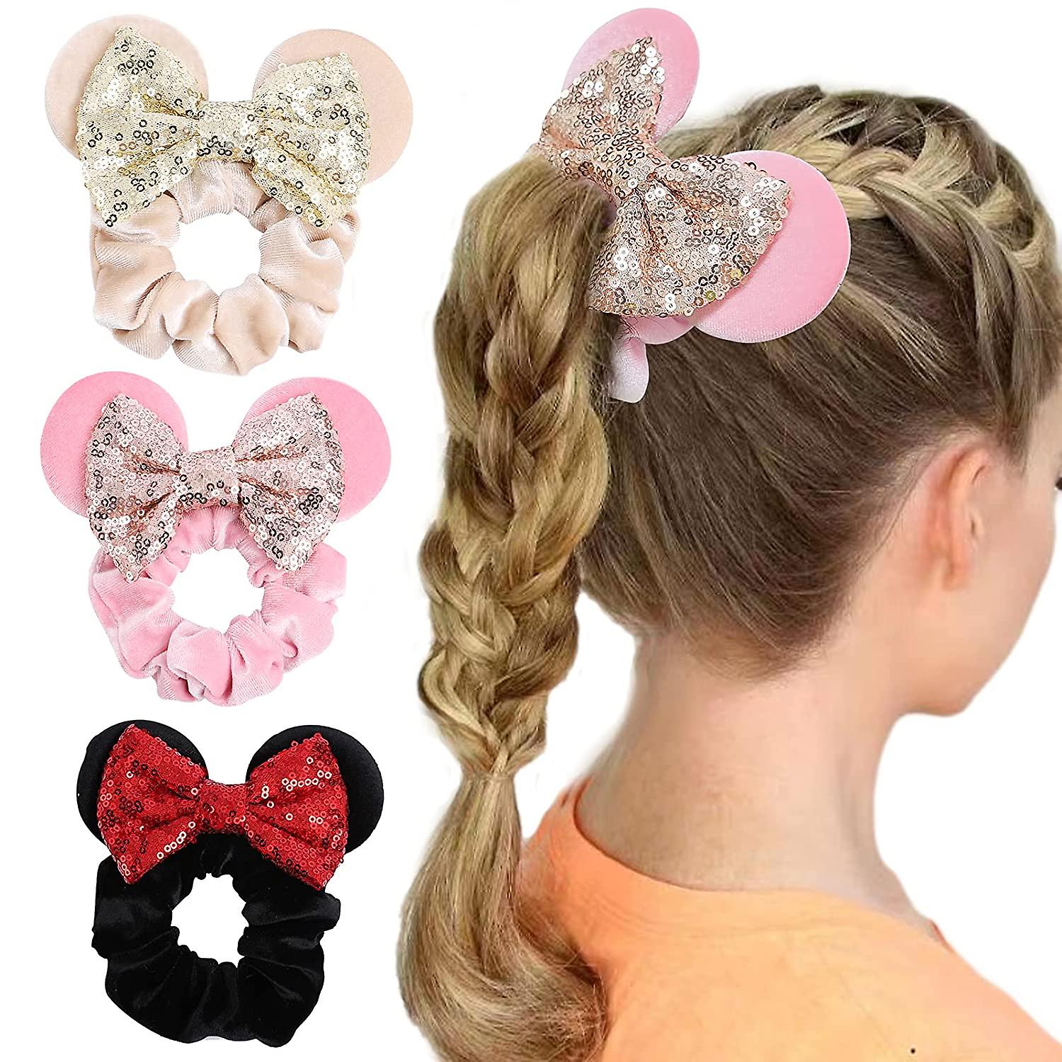 3-pack Headband Mouse Ear Bow Headband, Sequin Bow Velvet Elastic Rubber Hair Accessory, Ladies Shower Headband Glitter Bow Headband - Black + Ivory +