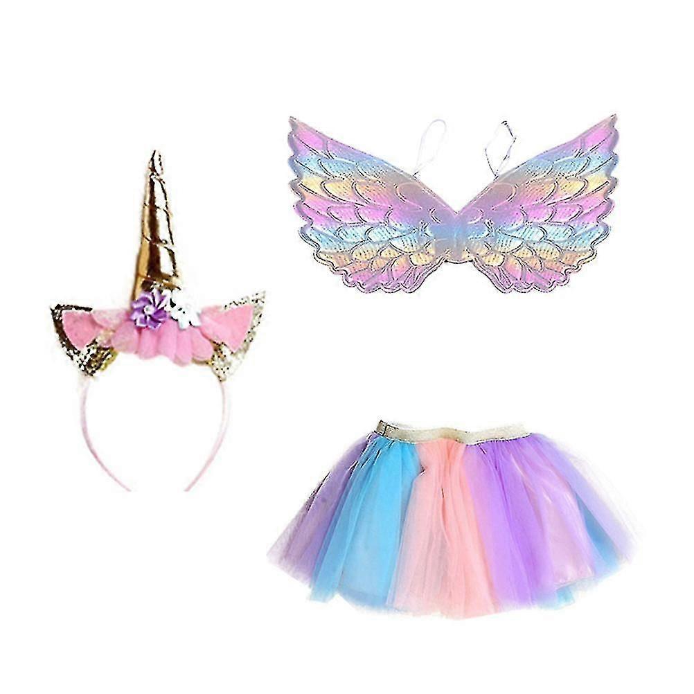 3pcs In 1 Set Unicorn Dress Colorful Girls Dress With Unicorn Hairband And Wing For Festival Birthday Carnival