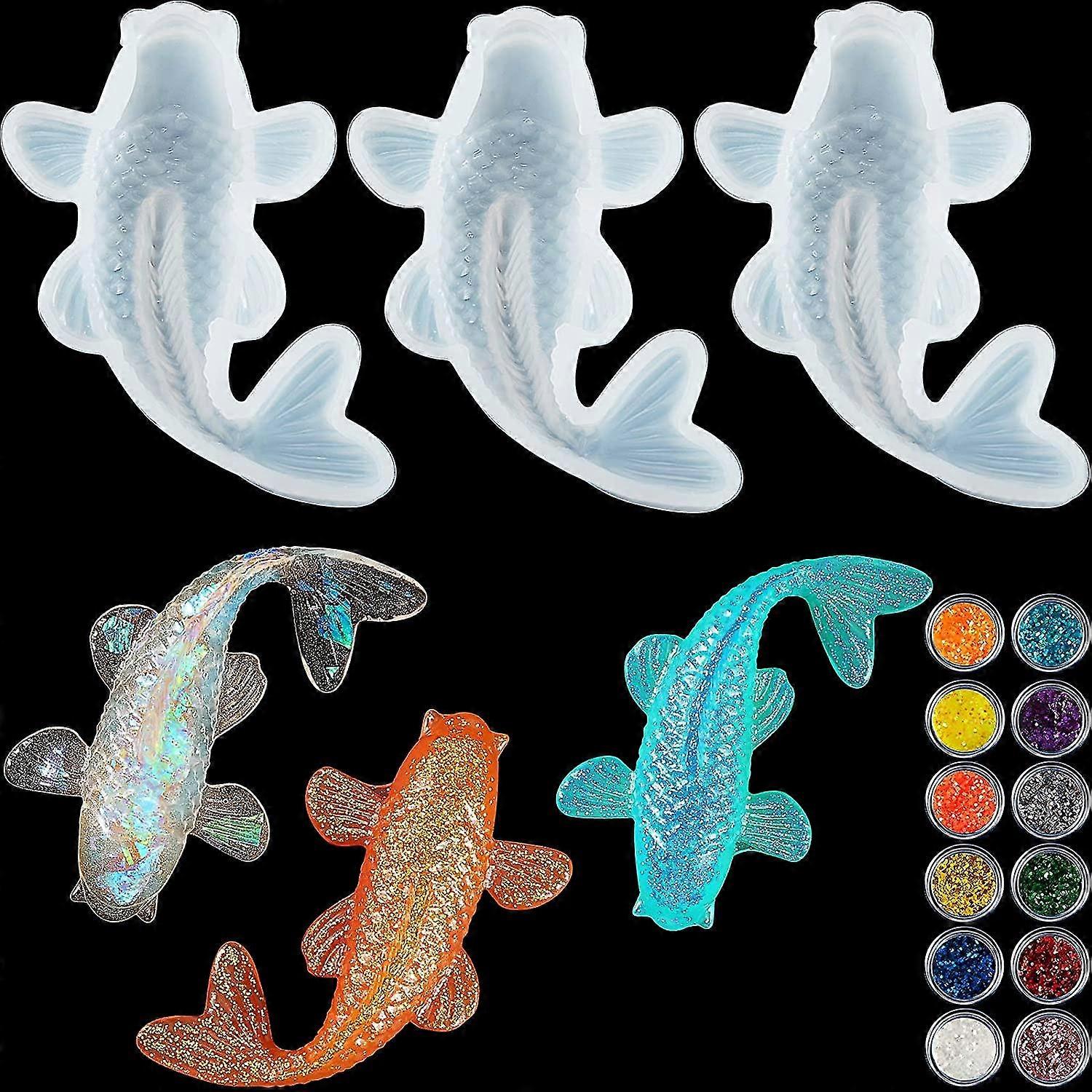 3 Pieces Koi Fish Silicone Resin Moulds Koi Goldfish Diy Pendant Silicone Resin Mold Fish Fondant Mold With Twelve Color Sequins For Diy Pendant Charm