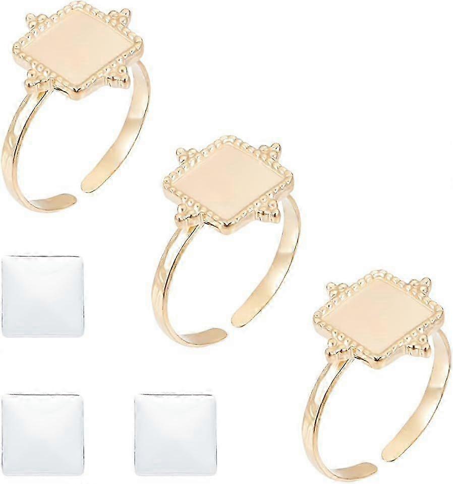 3 Pcs DIY Blank Square Ring Stainless Steel Open Cuff Ring Making Kit Real 14K Gold Plated Golden with Glass Cabochons Rings 17.6mm Base Ring Bezel Tr