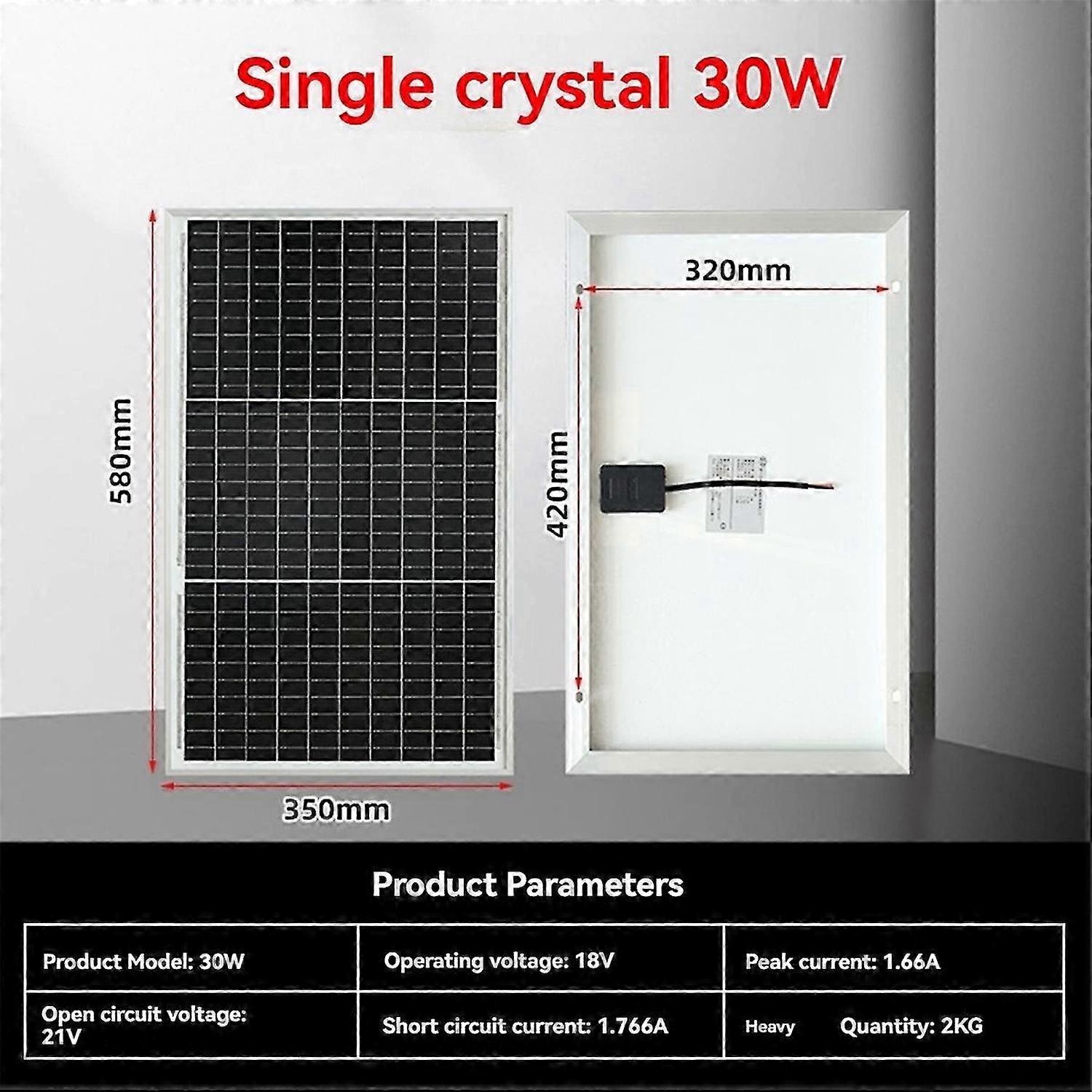 Suitable for power supply in multiple scenarios,Can be used in basic power supply scenarios Strong light-transmitting tempered glass,High light-transmittance coating, ultra-white tempered glass, light transmittance up to 93%, can effectively resist hail, rain and snow; can withstand 5400PA wind and rain impact High quality battery cells,High-quality battery cells can effectively good electrical performance of the battery panels Long service life Anodized aluminum alloy frame PPF anti-aging,The back is made of anti-aging backboard with good waterproof sealing.<br><br>Product model: 30W Open circuit voltage: 21V Working voltage: 18V Short circuit current: 1.766A current: 1.66A Colour:As Shown Material: Metal + Single Crystal Silicon<br><br>Package Contents: 1 * Solar Panel<br><br>Only the above package content, other products are not included. Note: Light reflection and different displays may cause the color of the item in the picture a little different from the real thing. The measurement allowed error is +/- 1-3cm.
