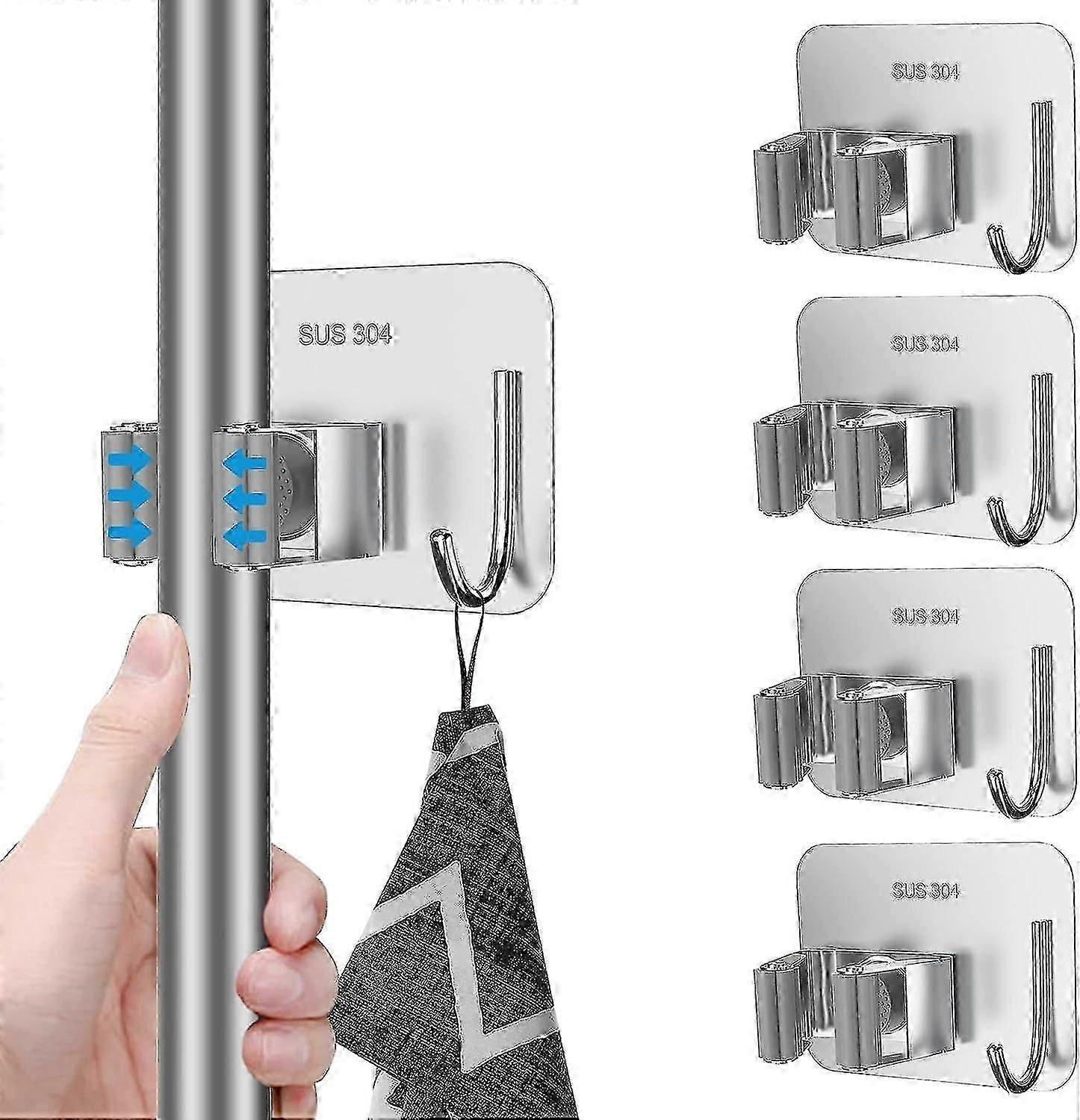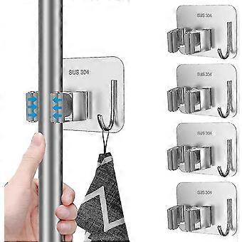 4 Mop And Broom Holders (grey), Stainless Steel No-drill Mop Holder Wall Mounted With Hook Pendant, Mop And Broom Organizer For Bathroom, Office, Kitc