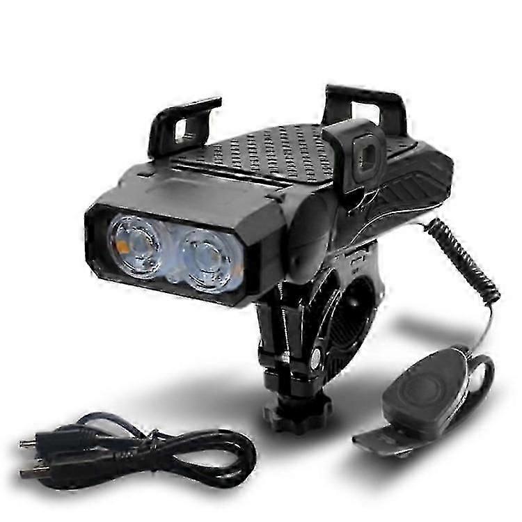 Features: 4 functions: 120 high-decibel speakers and bright headlights and mobile phone holder and mobile phone charging treasure 5 modes: high light-low light-strobe-fog light-fog light flash Long use time: 4000mAh battery, about 10 hours battery life Waterproof bicycle light for rainy days Specification: Name: Highlight bicycle front light Material: ABS Lamp beads: 2 x T6 Power supply: USB charging Capacity: 4000mAh Waterproof: life waterproof Battery life: about 10 hours Five modes: high light-low light-strobe-fog light-fog light strobe