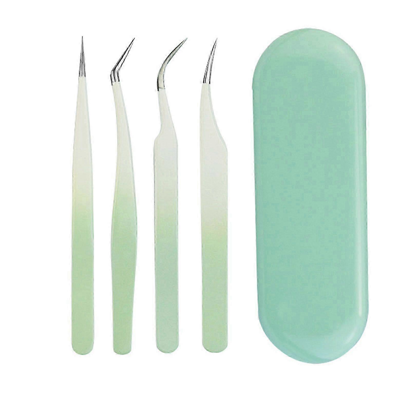 4pcs Eyelash Tweezers Set Stainless Steel False Eyelash Extension Tweezers Multifunctional Eyelashes Applicator Tools for Home Salon Green