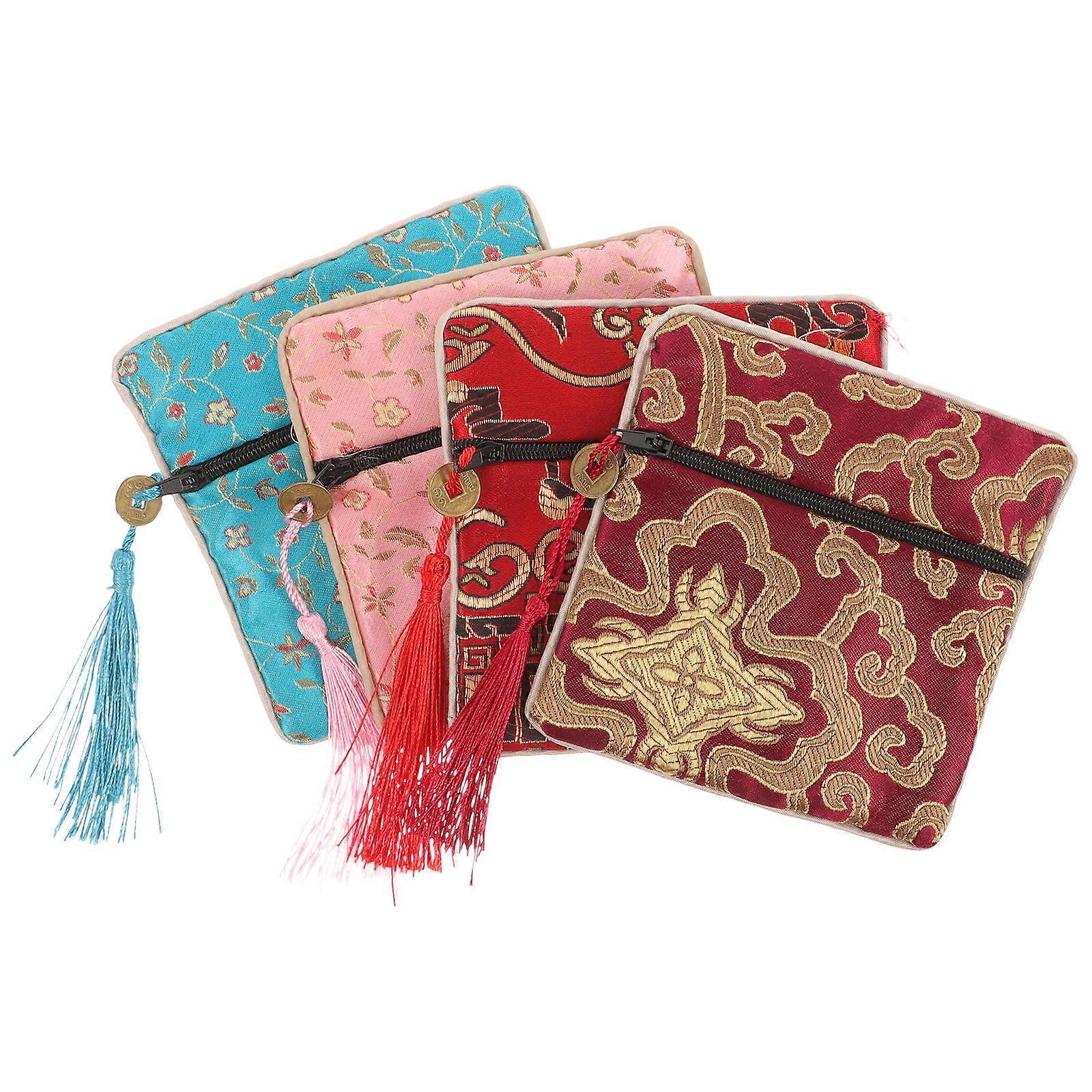 4pcs Embroidered Brocade Jewelry Pouches Travel Storage Organizers Silky Fabric Cosmetic Bags Wine Lake Colors