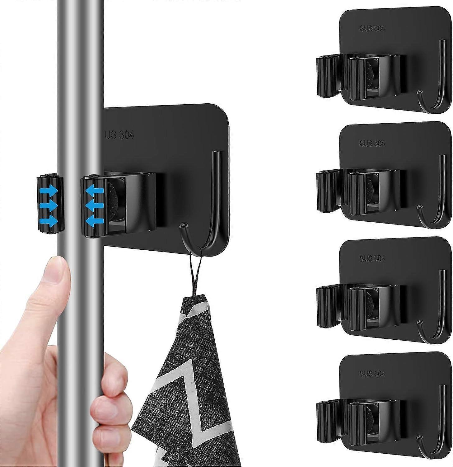 4 Pcs Mop Broom Holder, Stainless Steel No Drill Mop Holder Wall Mounted with Hooks Hanger(Bla IXM