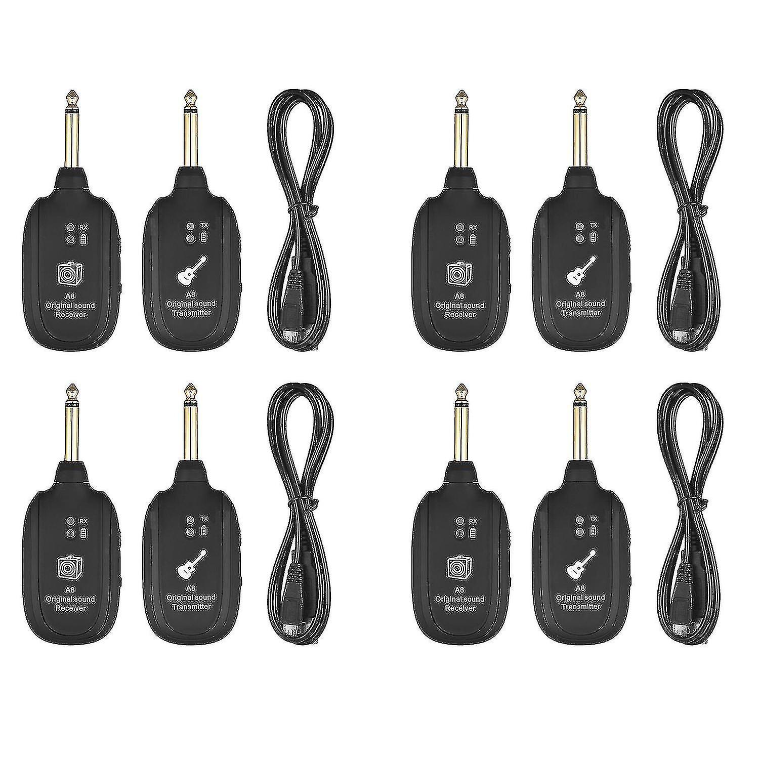 Rechargeable Built-in UHF Wireless Guitar System Transmitter Receiver,Wireless transmitter & receiver set for electroacoustic musical instruments like guitar, bass, etc.Uhf 730mhz sound transmission, anti-interface and ultra-short delay, giving you the .Supports 4 sets of devices that work at the same time, one-to-one; and maximum transmission range is up to 50 meters.Built-in rechargeable lithium battery, long hours of work; and comes with usb cable for convenient charging.Plug and play, simple to use; and lightweight size, easy to carry.Audio response range: 20Hz-20KHzFrequency: 730mhz ultrahigh frequencyTransmission range: max.50m (without obstacle); 30m (through the wall)Transmission delay: less than 4msPower supply: built-in 3.7v 600mah rechargeable lithium batteryCharging port: -usbColour:BlackMaterial:plasticSize:11 x 4.5 x 1.5cmPackage Contents:4 * Transmitter4 * Receiver4 * USB Charging Cable(random color,The specified color is not accepted)Only the above package content, other products are not included.Note: Light reflection and different displays may cause the color of the item in the picture a little different from the real thing. The measurement allowed error is +/- 1-3cm.