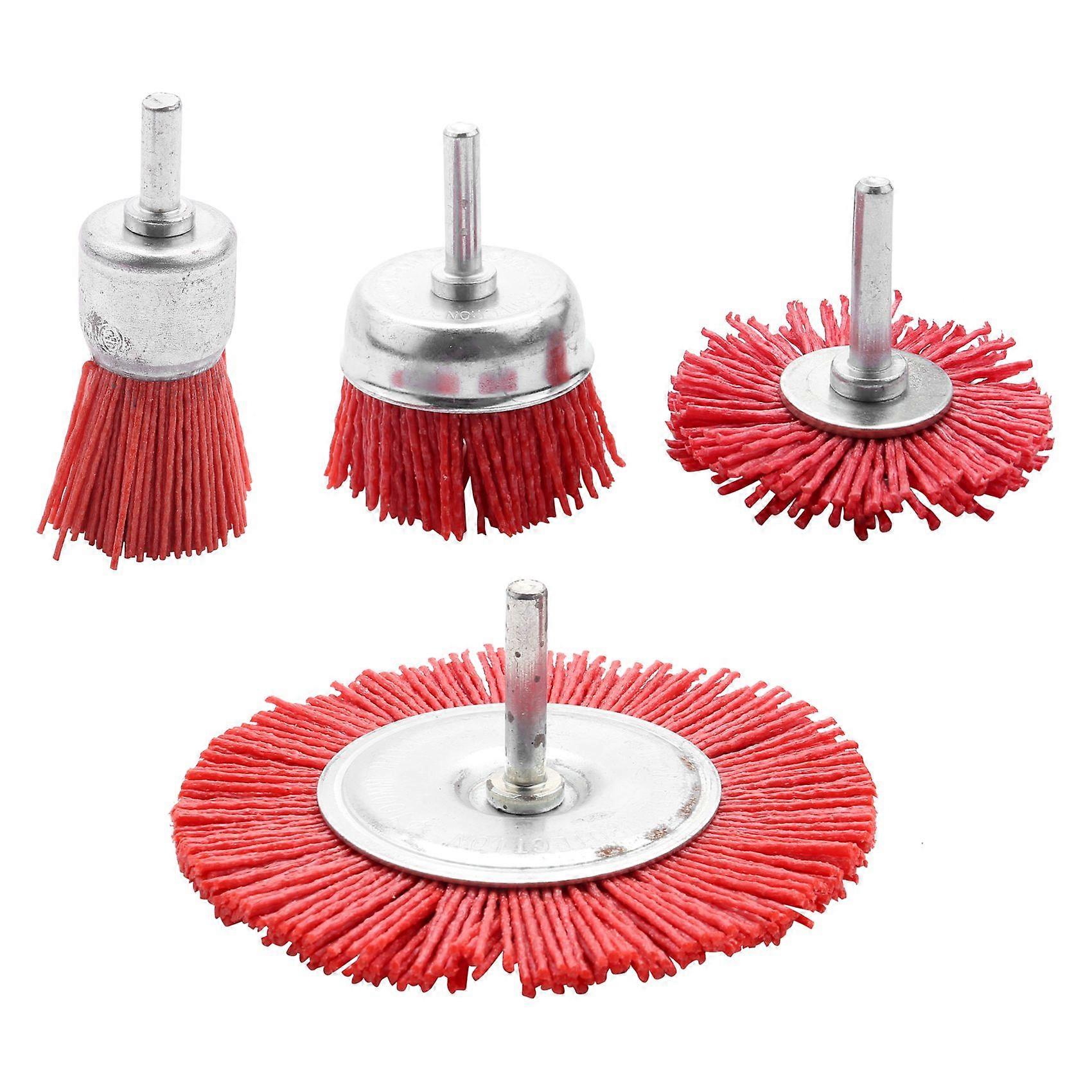 Maximum 4500 RPM. Nylon cup and wheels abrasive Brushes mounted on 1/4 inch Hex shanks, Fits any drill or Impact Drivers. Commonly used for prepping surfaces, deburring, light removal of paint and coatings. This Nylon Brush is perfect for cleaning delicate parts for Automotive, Metalwork, Woodworkers, Refurbishers and DIYs, with worry about damage or scratches. High durability, strong and tough brush, long service life, shorten polishing time and improve equipment efficiency. Colour: red Material: nylon + stainless steel Size: handle diameter 6mm Package Contents: 1 * 4 inch Circular Wheel Brush 1 * 2 inch Circular Wheel Brush 1 * 2 inch Wire Cup Brush 1 * 1 inch Wire End Brush Only the above package content, other products are not included. Note: Light and different displays may cause the color of the item in the picture a little different from the real thing. The measurement allowed error is +/- 1-3cm.