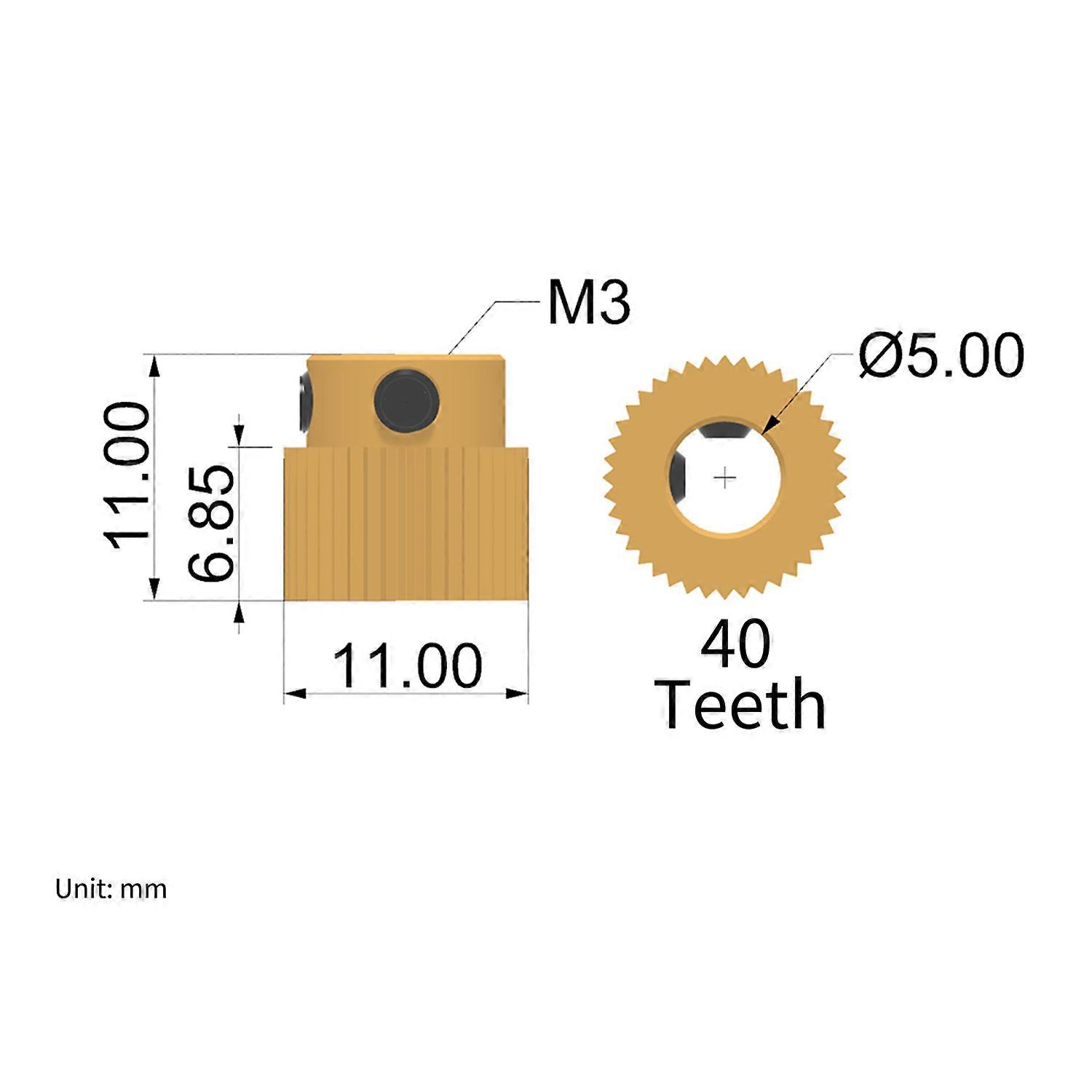 1pc Brass Extruder Pulley 40 Teeth 5mm Bore 11mm Outside Diameter Compatible with Creality Ender3/3S/V2/5 CR10/10S/V2 3D Printer Features: product, which can be a good repair replacement. Made of brass, durable and not easy to wear. Used for extruding filament of 3D printer extrusion mechanism. Compatible with Creality Ender3/3S/V2/5, CR10/10S/V2 3D Printers. Specifications: Material: Brass Teeth Number: 40 Bore Diameter: 5mm Top Screw Model: M3 * 3 Application Models: Creality Ender3/3S/V2/5 CR10/10S/V2 3D Printer Item Size: 11 * 11 * 11mm/ 0.4 * 0.4 *0.4in Item Weight: 5g/ 0.2oz Package Size: 15 * 10 * 2cm/ 5.9 * 3.9 * 0.8in Package Weight: 30g/ 1.1oz Packing List: 1 * Extruder Pulley