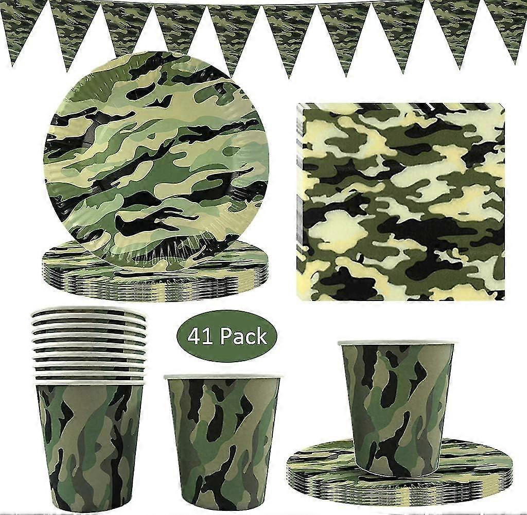 41 Pack Camouflage Disposable Tableware, Camouflage Party Supplies with Camo Plates Cups Napkins and Triangle Banner for Army Military Hunting Themed