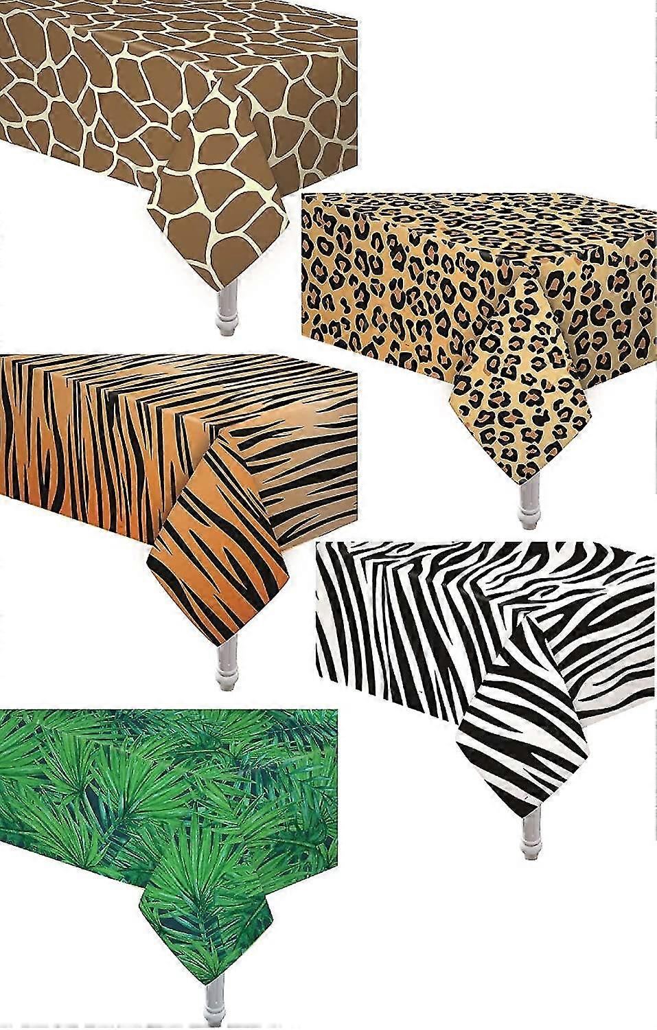 5 ~ Animal Print Tablecloths ~ New in sealed individual package.^ 1 Cheetah Tablecover / 1 Giraffe Tablecover / 1 Zebra Tablecover / 1 Tiger Tablecover / 1 Leaf Tablecover^ Manufactured to the Highest Quality Available^ Table coverSize: 54" x 108" A great way to fight off stains, spills, and drink rings^ All Purpose : For parties, Paint arts and crafts with your little ones and their friends, or to catch messy spills ^