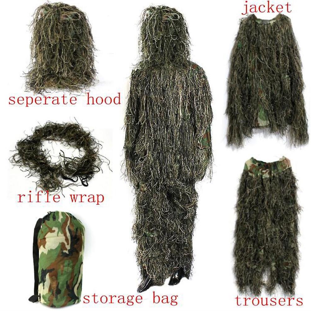 Features 1、Disappeared in the woods: the vivid green leaf camouflage makes you almost invisible in the woods. Ideal for hunters, nature photographers, bird watchers and others who want to stay undetected. 2、Material: Made of tough and durable polyester. 3、Comfortable, breathable and durable: made of tough and durable polyester. Lightweight, loose and breathable, it makes the wearer feel more comfortable. 4、Includes 5 pieces: hood, jacket, pants, a strap and a bag. 5、Wide range of applications: used for tracking, paintball shooting, surveillance, wildlife photography, bird watching, etc. Specification Colour: wooldland camo Material: Polyester Set Includes: 1 x trousers, 1 x jacket, 1 x hood, 1 x wrap, 1 x storage bag. Size: Shoulder: 21 inches Sleeve: 29 inches Jacket Length: 31 inches Pants Length: 43 inches Waist Size: adjustable, up to 48 inches Package List 1 x Trousers 1 x Jacket 1 x Hood 1 x Wrap 1 x Storage Bag
