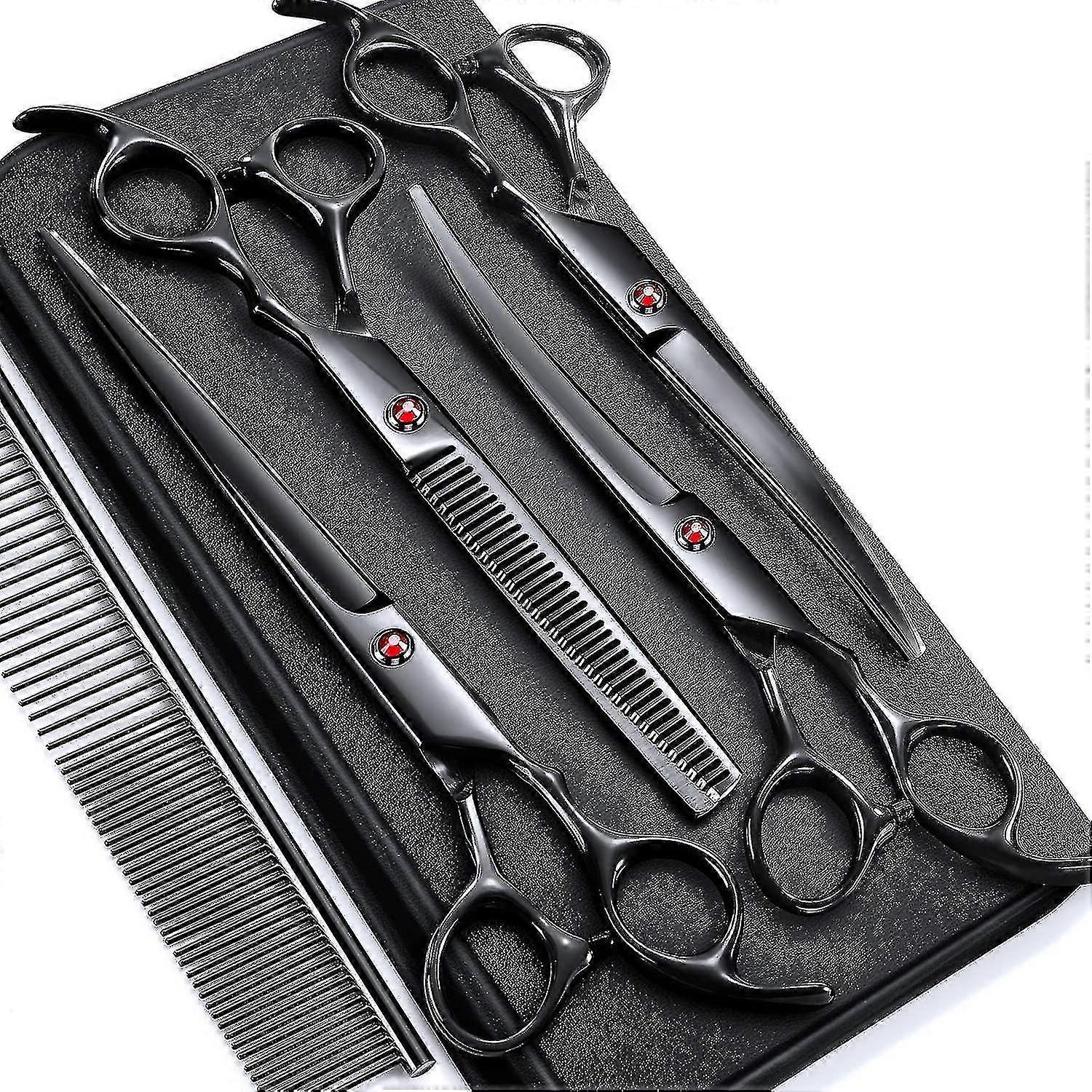 Necessary Tools for Professional Dog and Cat GroomingThe dog grooming scissors are made of 4CR stainless steel material, immersed in ceramic coating, carefully polished and ground after 60 processes, the blade is not rusted, easy to clean, and the blade is sharp for a longer time^Sharp Knurled Edges & Rounded HeadsThe sharp knurled edges make the cut of these dog grooming scissors more professional, smoother and more stable, perfect for eliminating hair pads and tangles. Safety round tips to keep pets safe and won't hurt the face and don't scare pets^Ergonomic Design, Comfortable to HoldWe also know that grooming can be tiresome, so we made the ergonomic handle to fit comfortably in your hand, your hand won't when using scissors feeling tired and sore^7-in-1 Dog Grooming Scissors SetDog Grooming Scissors Set comes with 6.5" Dog Grooming Scissors + 7" Dog Downbending Scissors + 7" Dog Upbending Scissors + 7" Straight Grooming Scissors + 1 Comb + 1 Storage Box^Professional after-sales serviceIf you are not satisfied with our products, you can contact us at any time, we will provide the most professional after-sales service